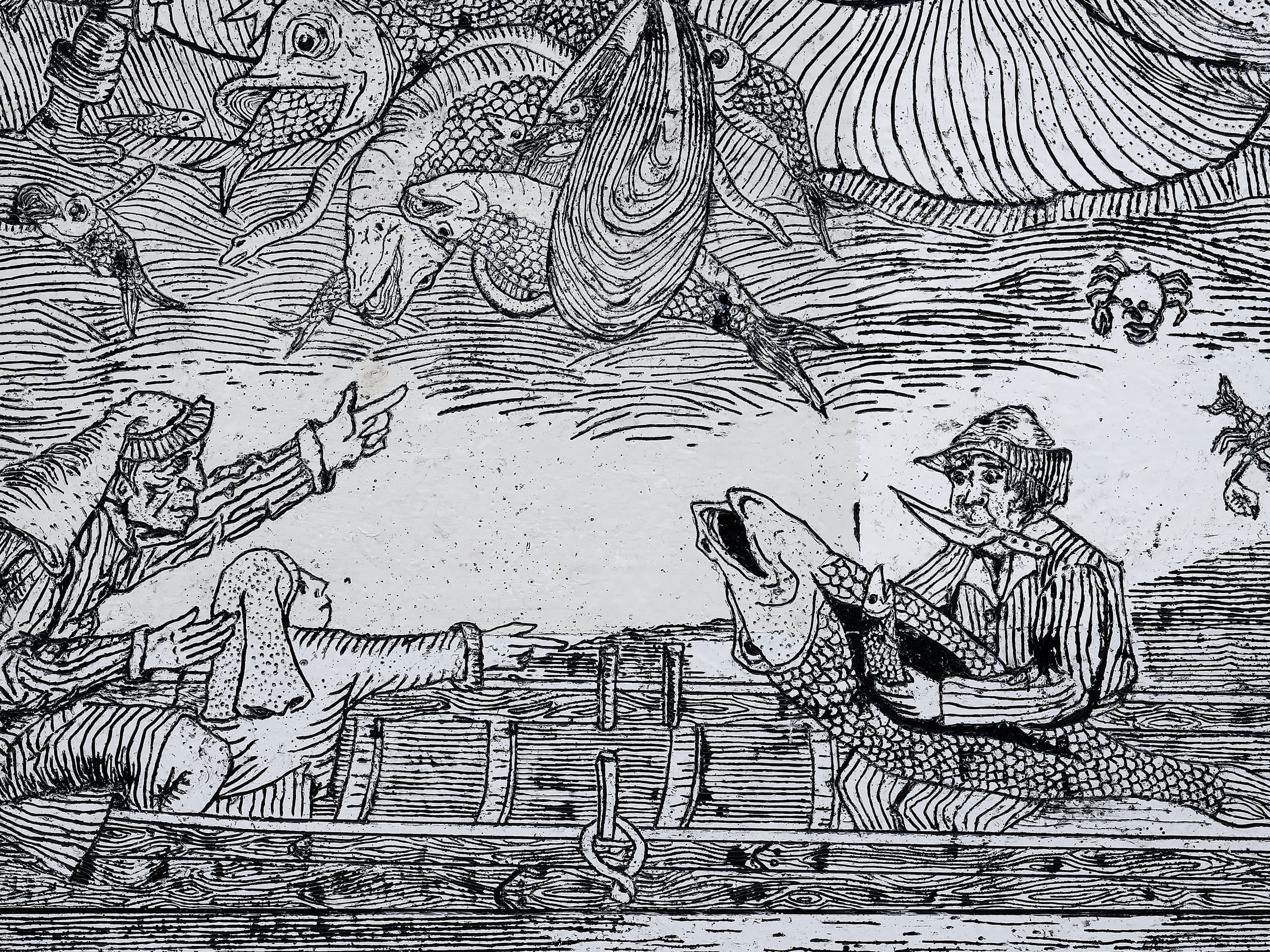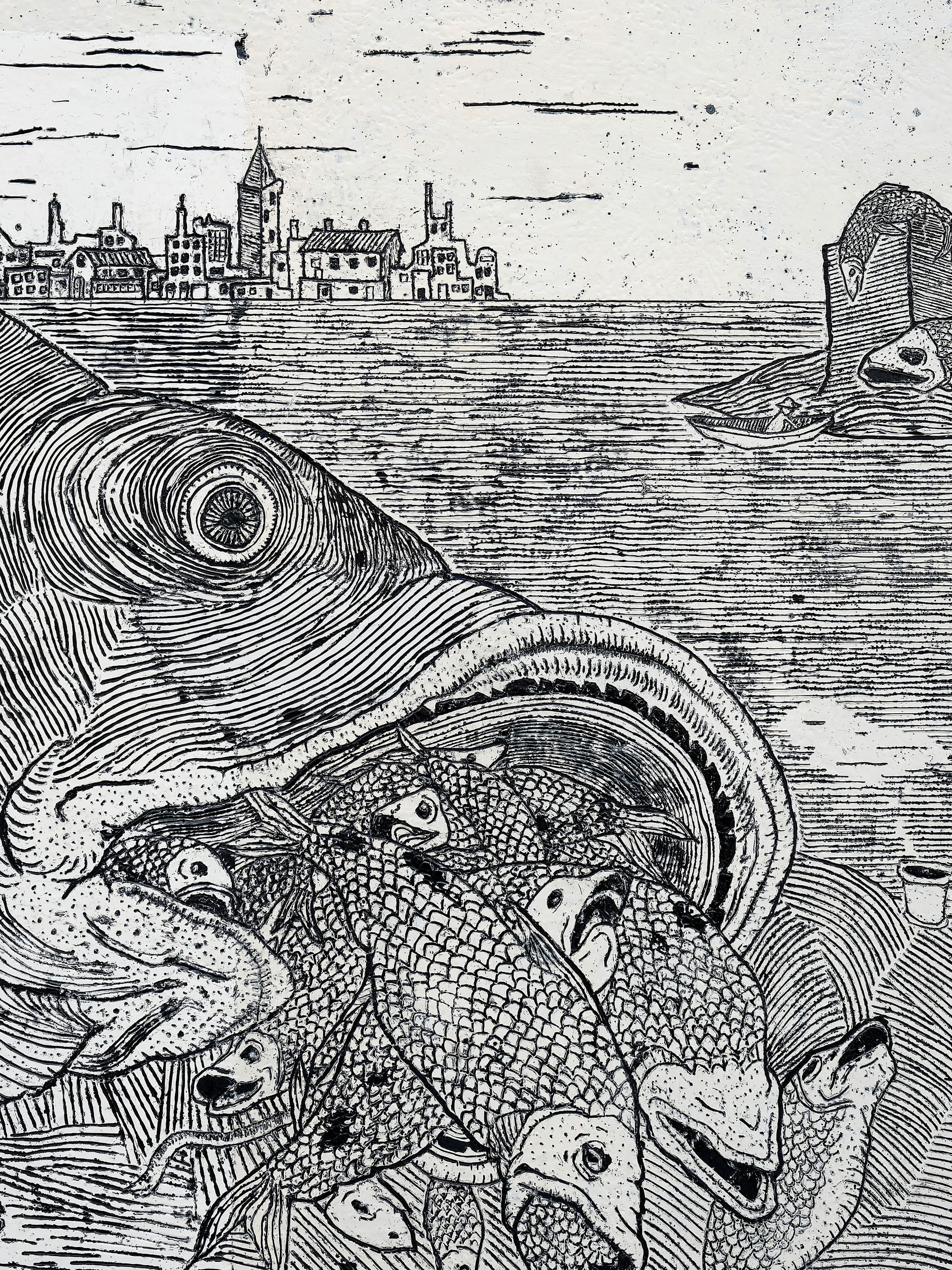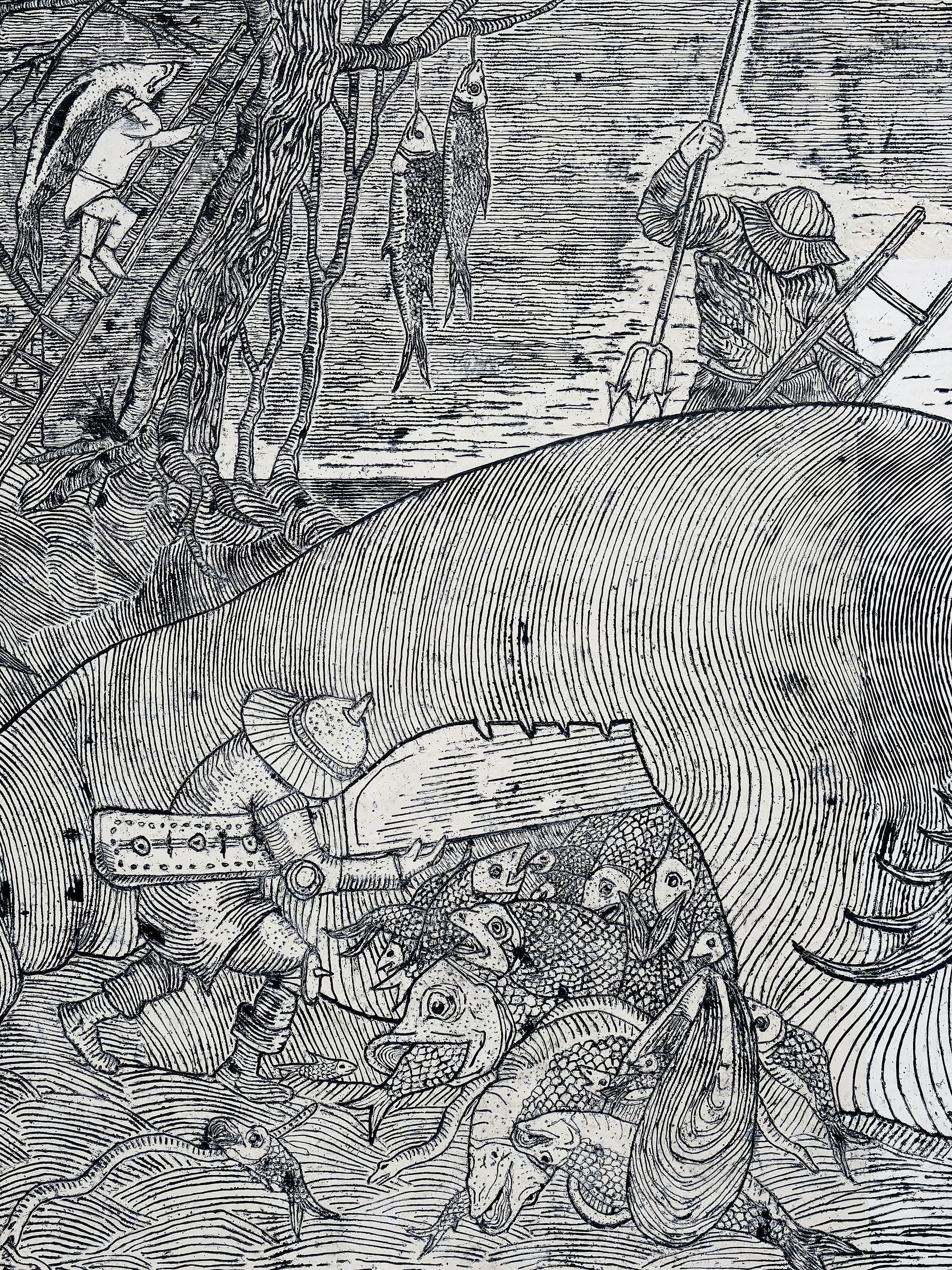 Big Fish after Bruegel is an encaustic painting made after Pieter Bruegel the Elder’s (the Netherlands, ca. 1525–1569) work Big Fish eats Little Fish, made in 1556. The original painting is known as one of the most haunting of Bruegel's images, and is among the first of the artist's many interpretations of proverbs in paintings or prints.