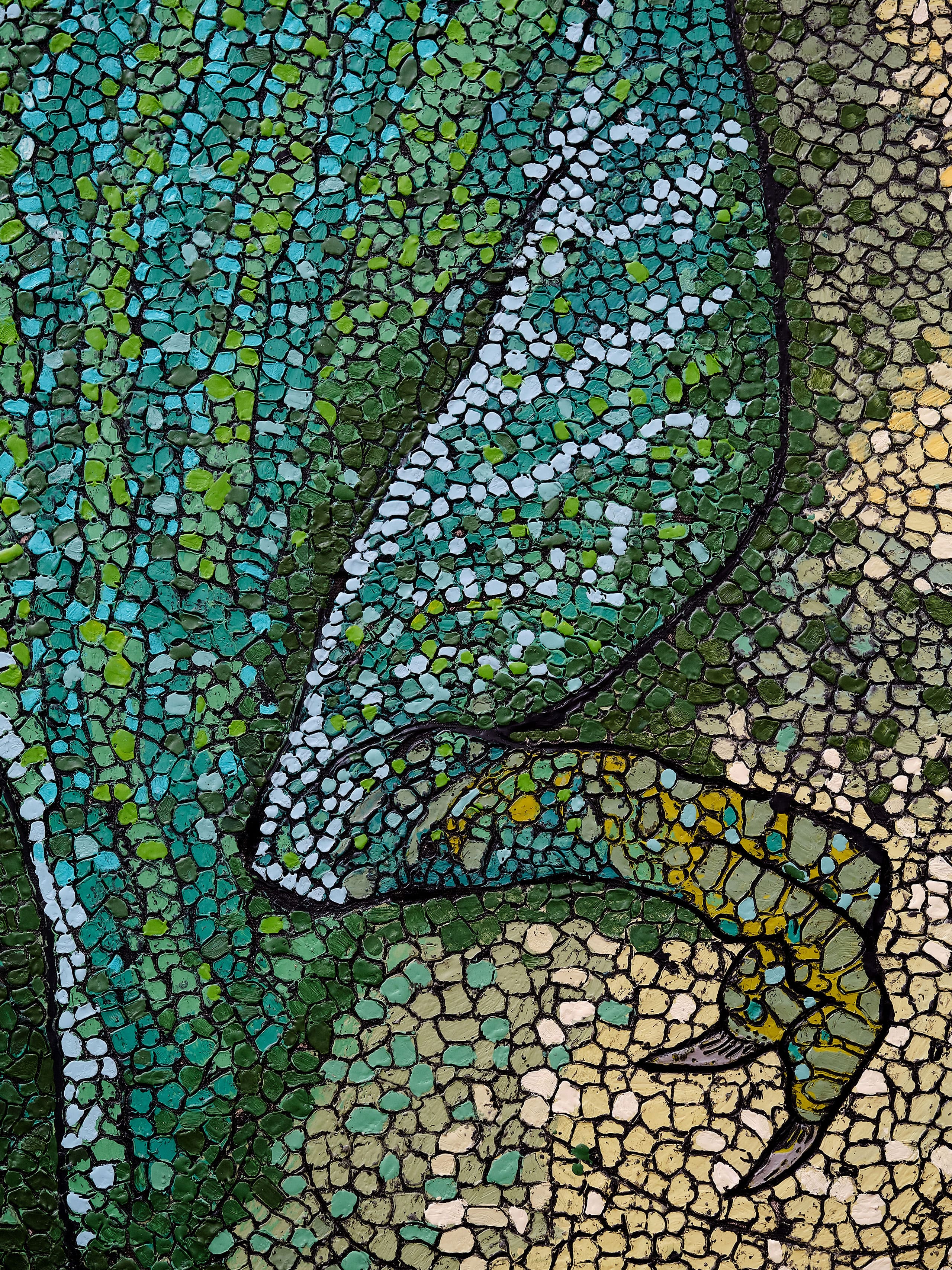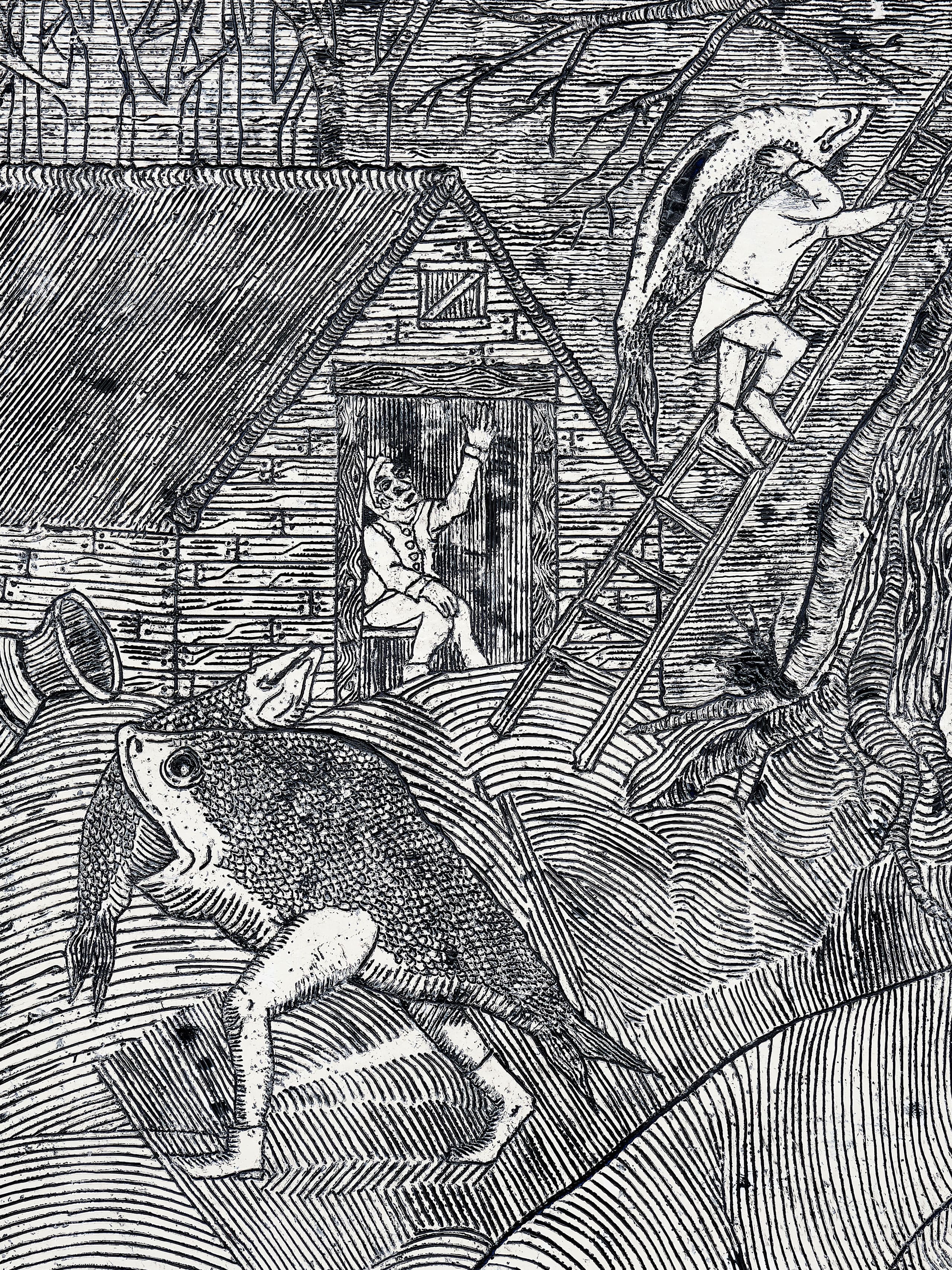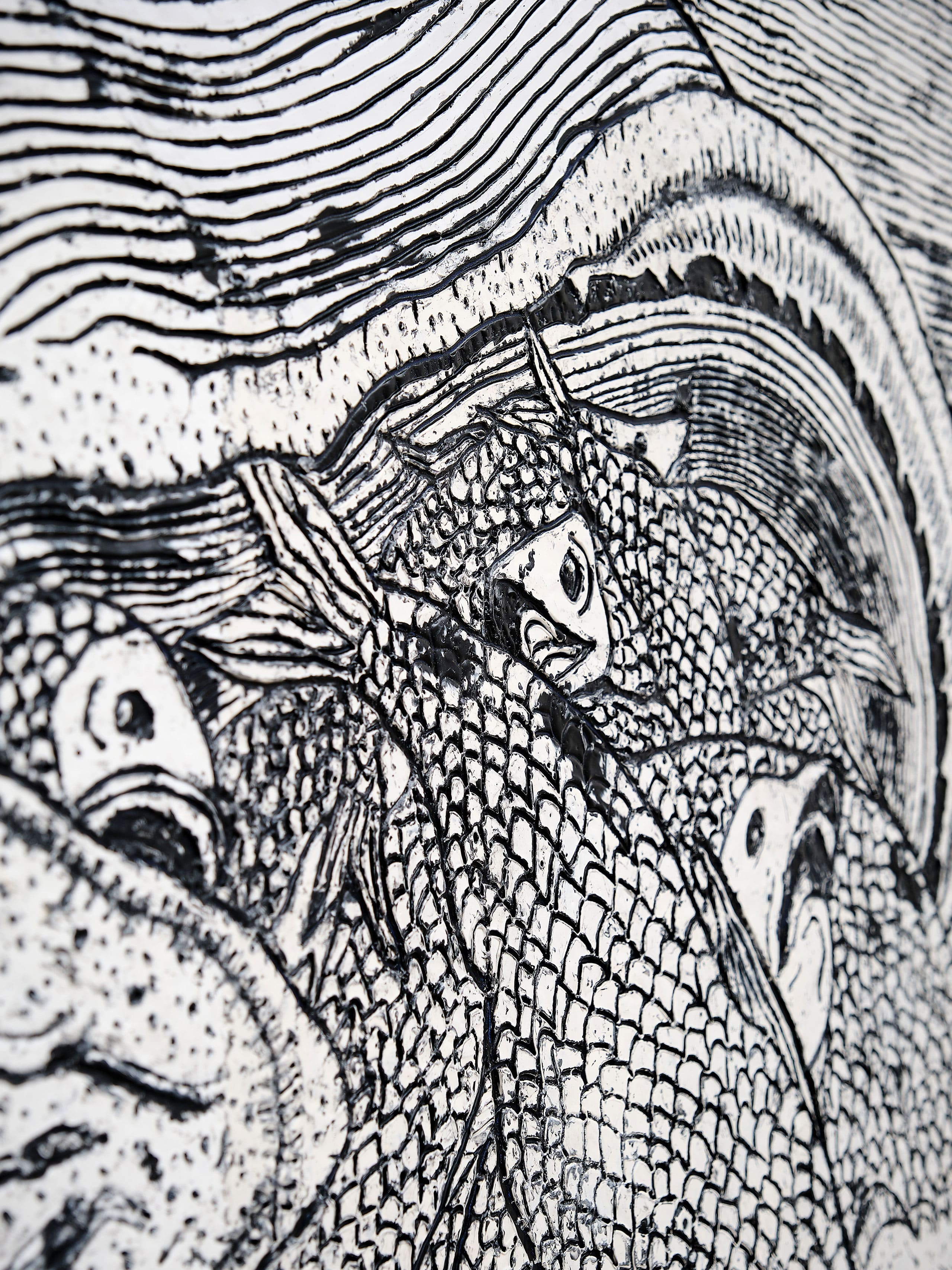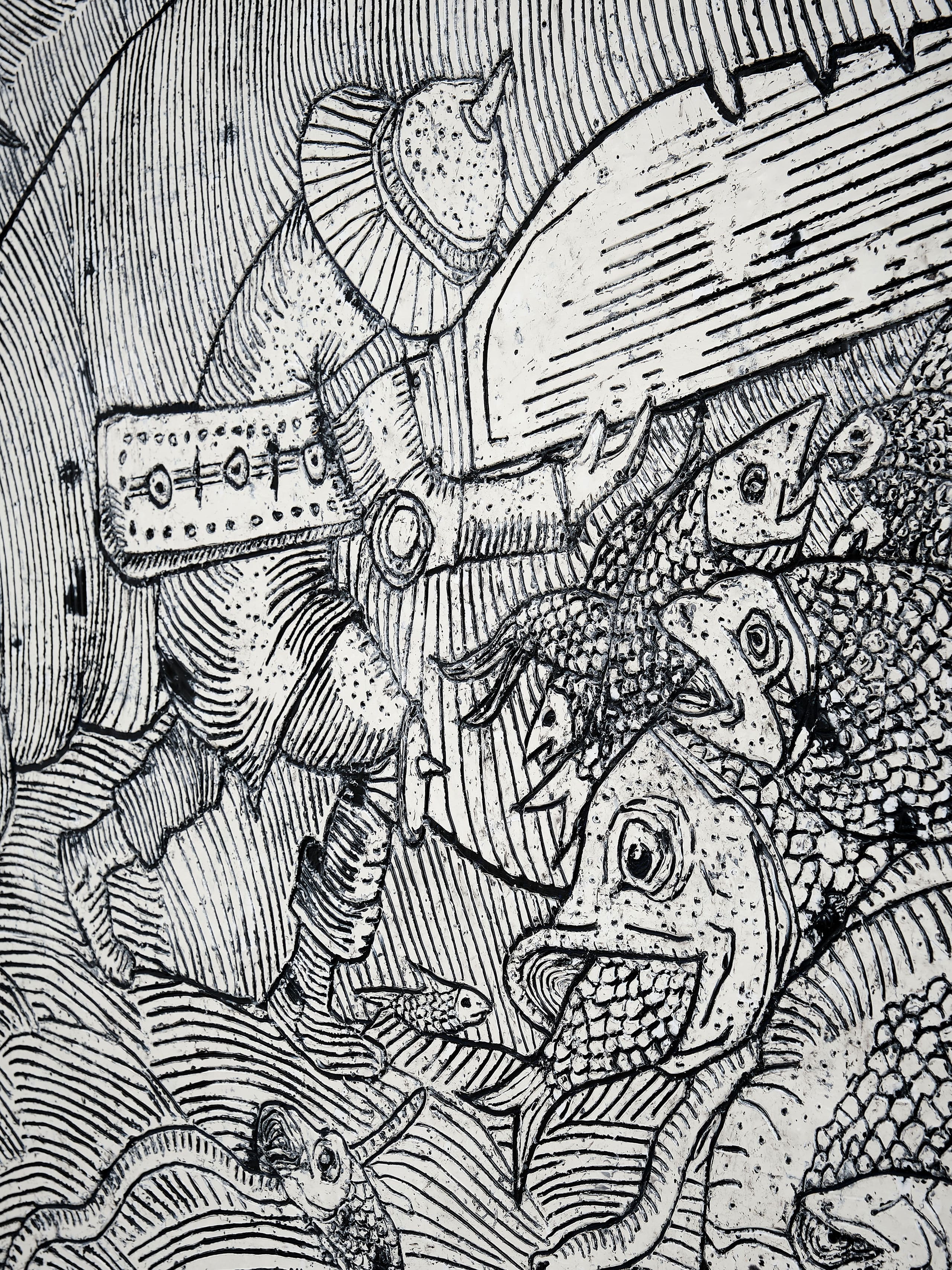 Big Fish after Bruegel is an encaustic painting made after Pieter Bruegel the Elder’s (the Netherlands, ca. 1525–1569) work Big Fish eats Little Fish, made in 1556. The original painting is known as one of the most haunting of Bruegel's images, and is among the first of the artist's many interpretations of proverbs in paintings or prints.