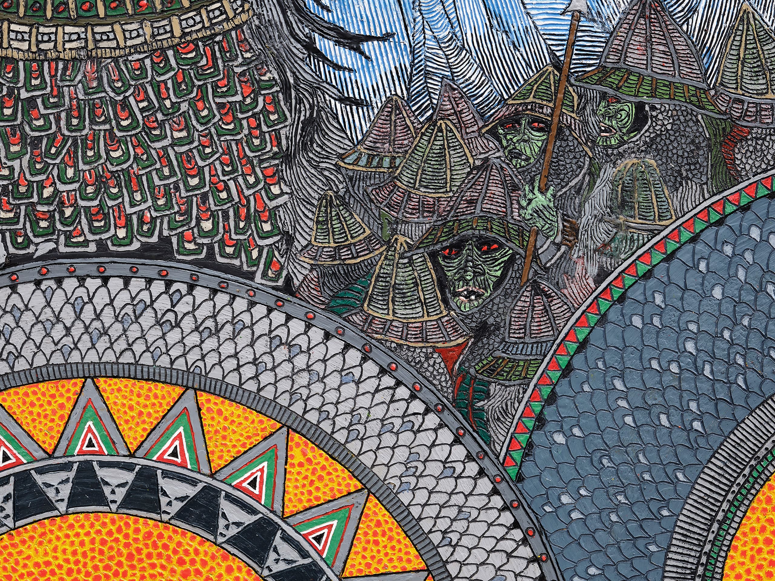 The original painting referenced by Armstrong is called Battle of the Hornburg and is an illustration from the book The Characters from Tolkien by David Days. The battle at Hornburg at Helm’s Deep was the first great battle in the Lord of the Rings trilogy, and the painting depicts some of the evil wizard’s, Saruman’s, forces – orcs – ready for the combat.