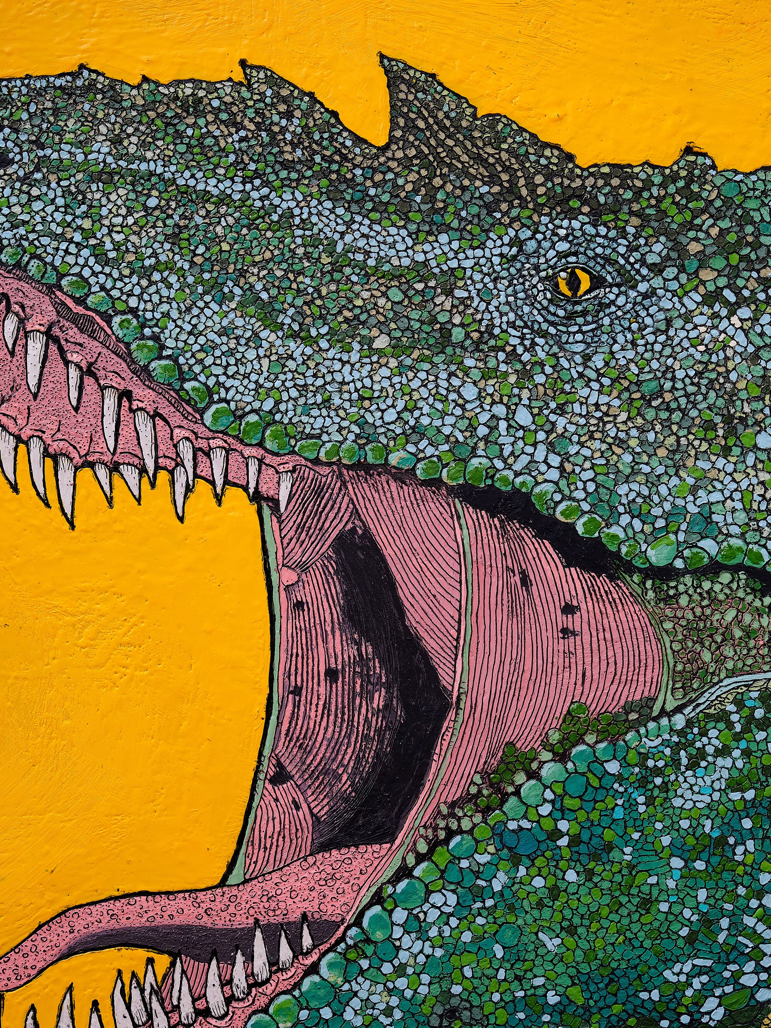 The dinosaur has been a reoccurring motif in Armstrong’s works. Armstrong once had a bedsheet with dinosaurs, and he later recreated them in paintings, which his son would refer to as the “dinos”. In this exhibition, Armstrong has made the dinosaur a more realistic and striking figure, with the bronze sculpture and this enlarged image of a t-rex.