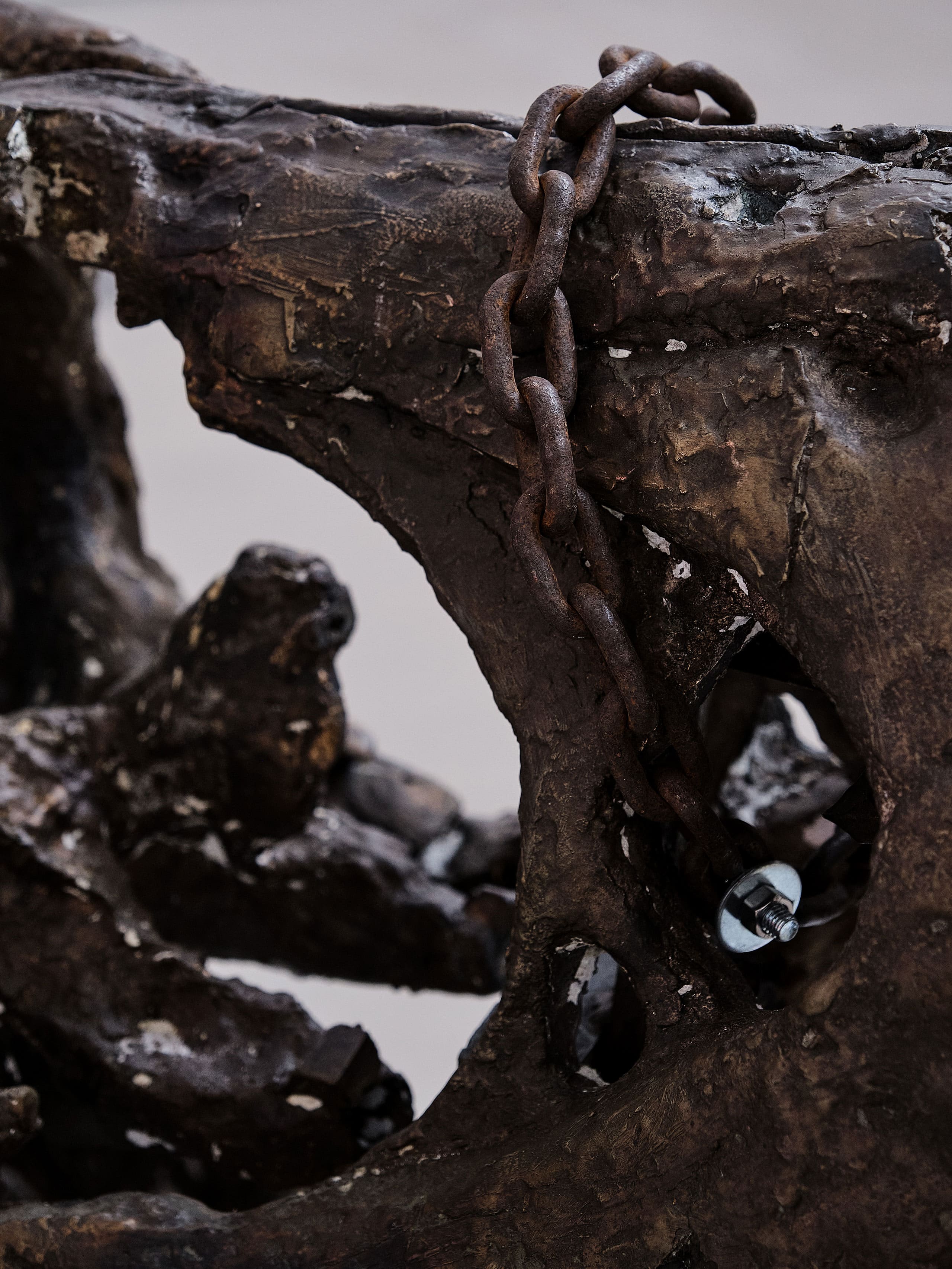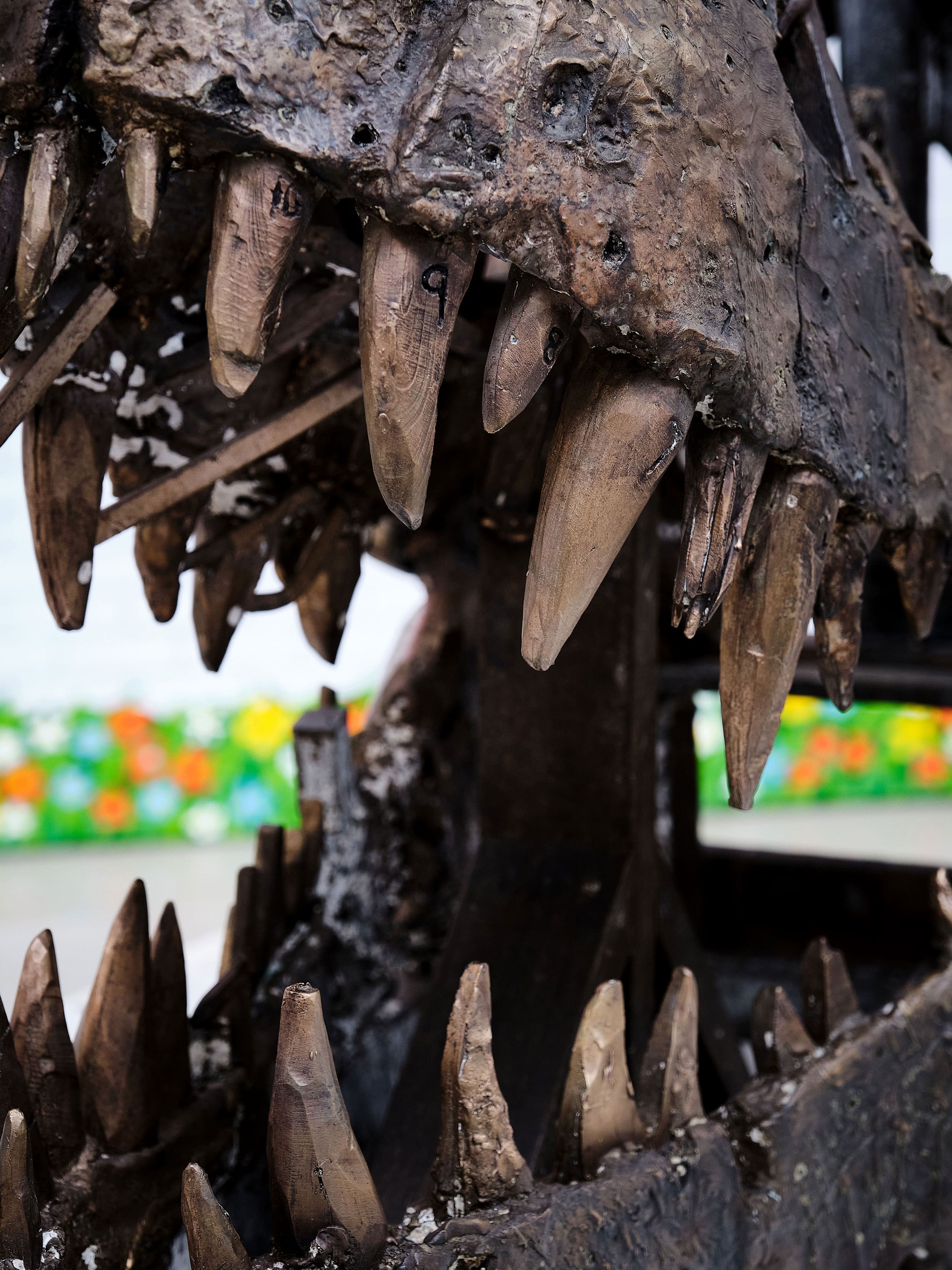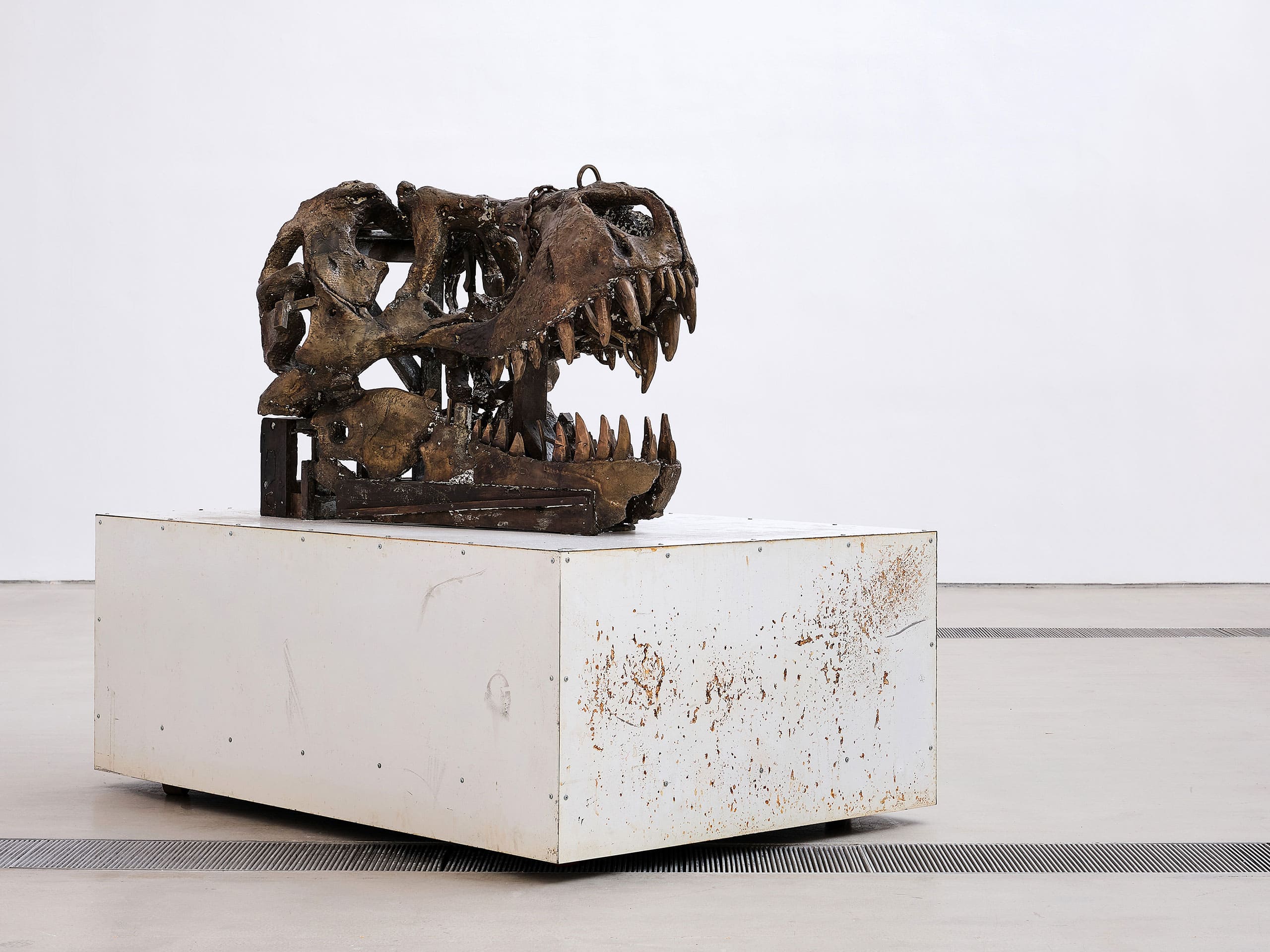 The sculpture, Maximo, is a life-size cast of a tyrannosaurus rex skull. While the dinosaur as an image is not new to Armstrong’s practice, it is interesting to note that for this artwork the artist has chosen to work with a real-life duplicate and not a cartoon, children’s drawing or imagery from popular culture. The sculpture is named after the artist’s son, emphasizing the personal as well as the childish and playful aspect of the work. At the same time, Armstrong plays with the contradictory nature of the sculpture, representing the familiar and the uncanny, making a dream perhaps too realistic by materializing it.
