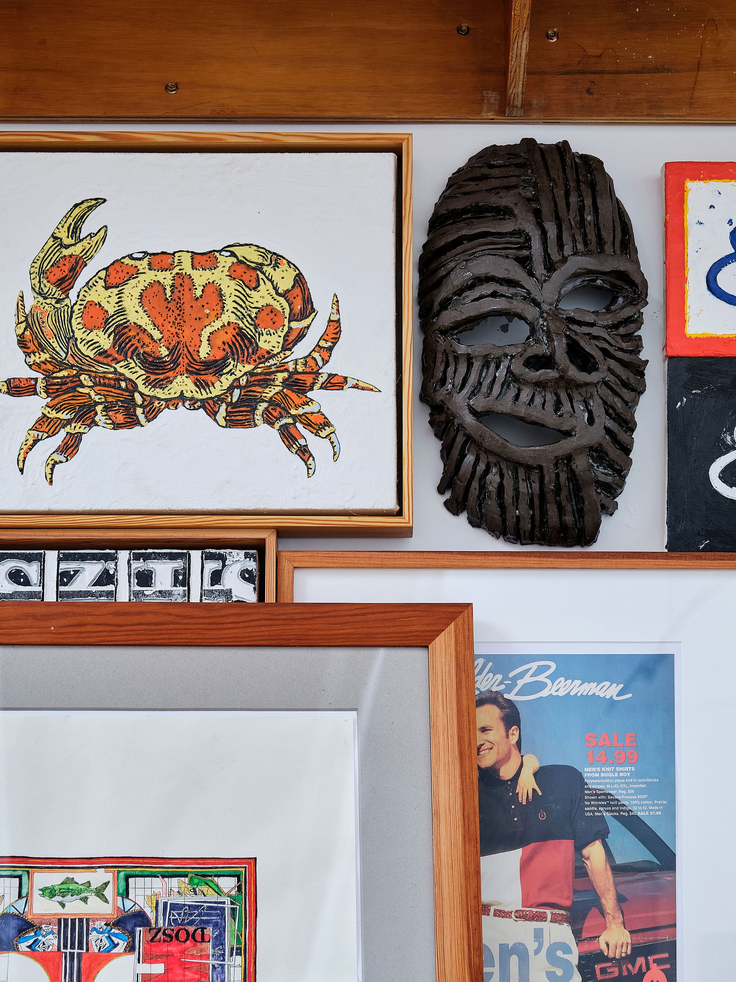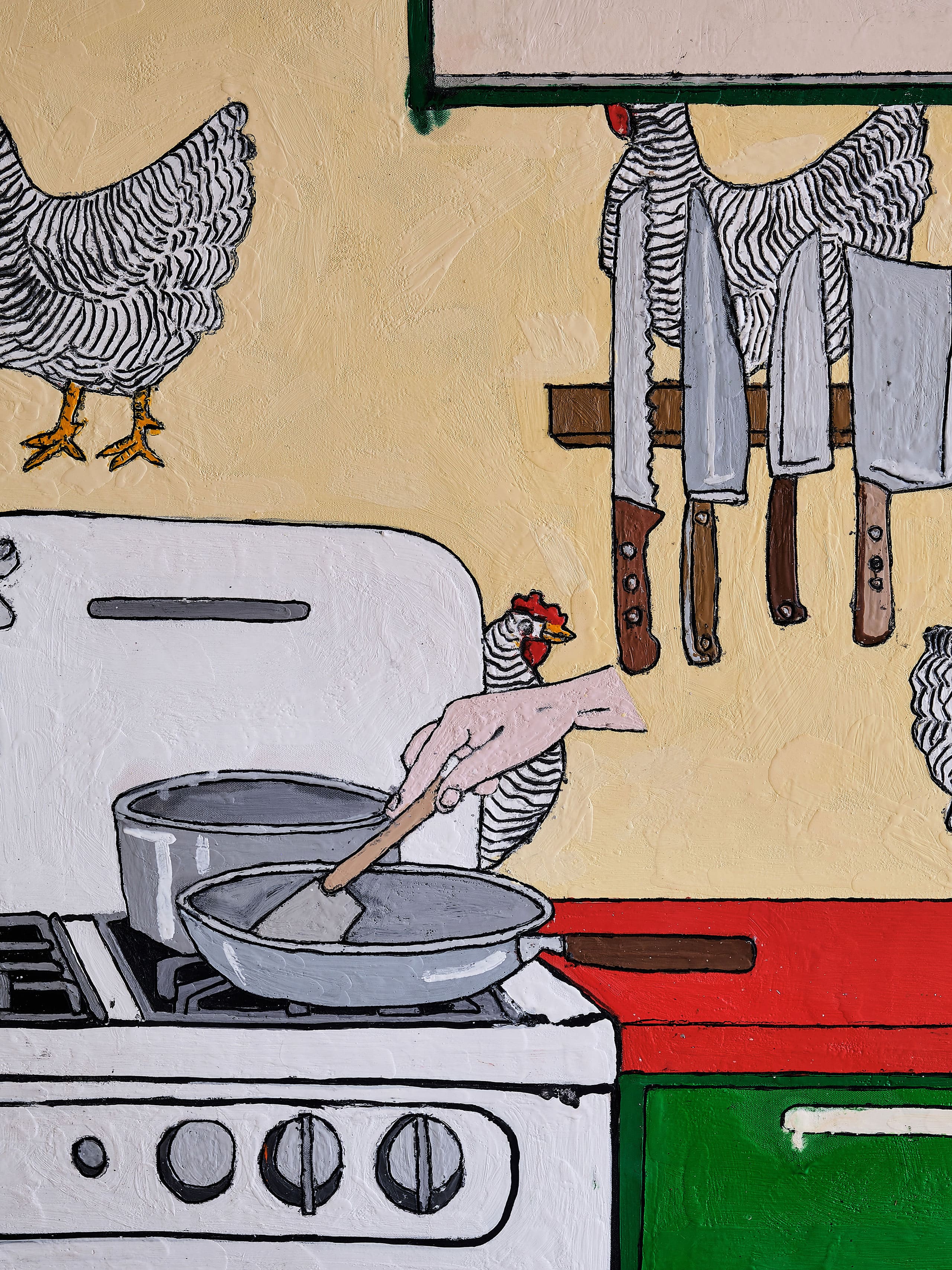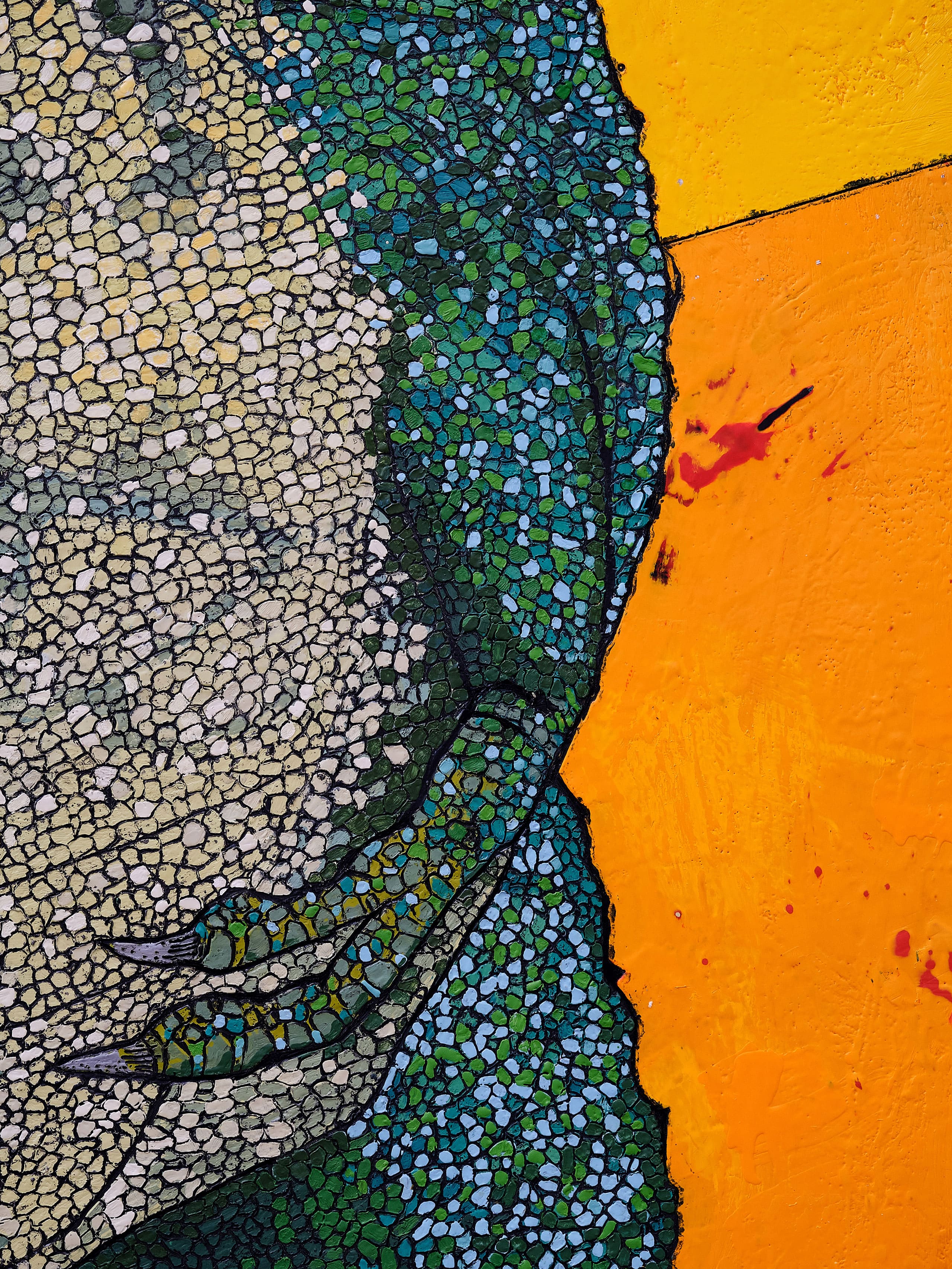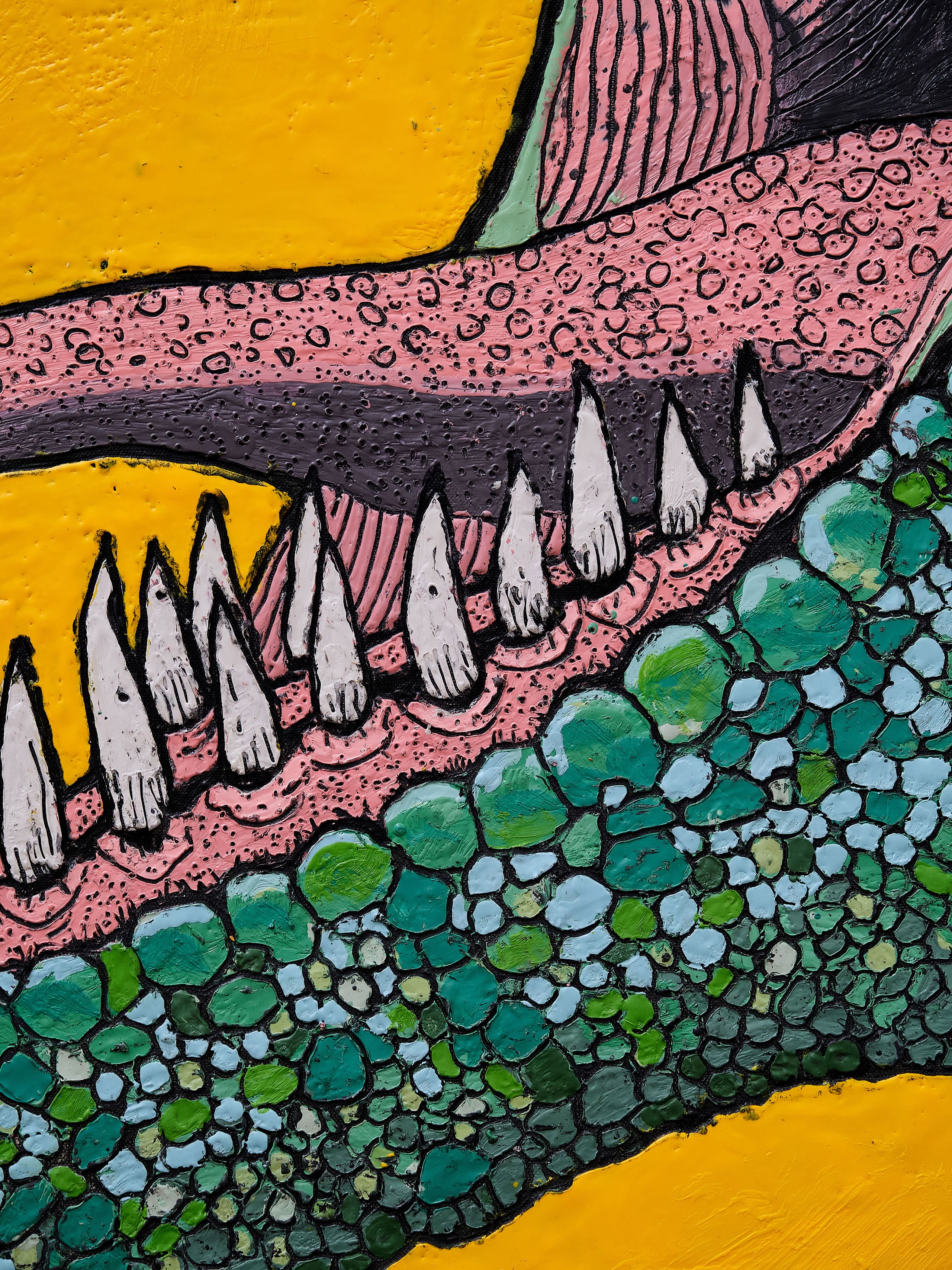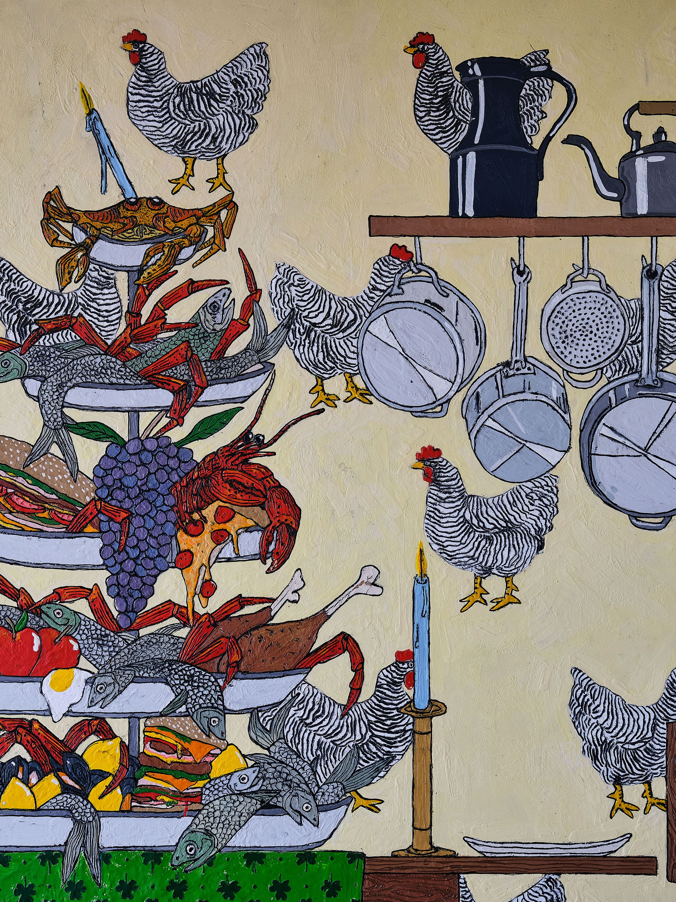 Each panel of the house is handmade, like all other canvases he uses. The house is loaded with symbols and images familiar to most people, no matter where you are from, associated with the idea of the comfort of home, such as pots and pans, a toothbrush, books and pictures on the wall. However, there are also elements that challenge the notion of an ideal home: uncanny and scary things like monsters under the bed, legs in the fireplace, and a mermaid’s tail in the bathtub. Together these components make up the sum of a house and of one’s life. The familiar and the unfamiliar details symbolize the good and the bad memories, and thus make one’s experience of exploring the Encaustic House a mix of ease and unease.