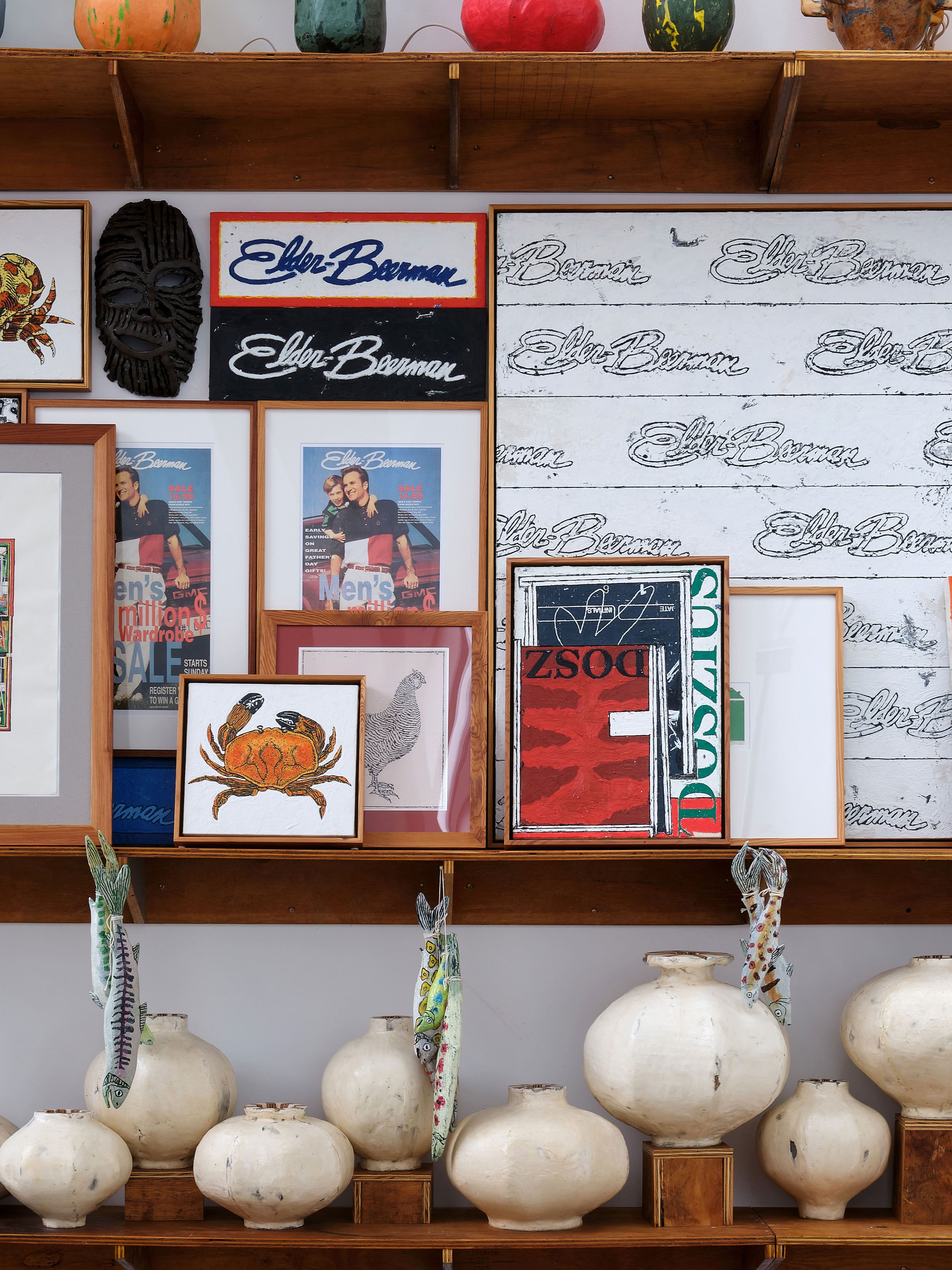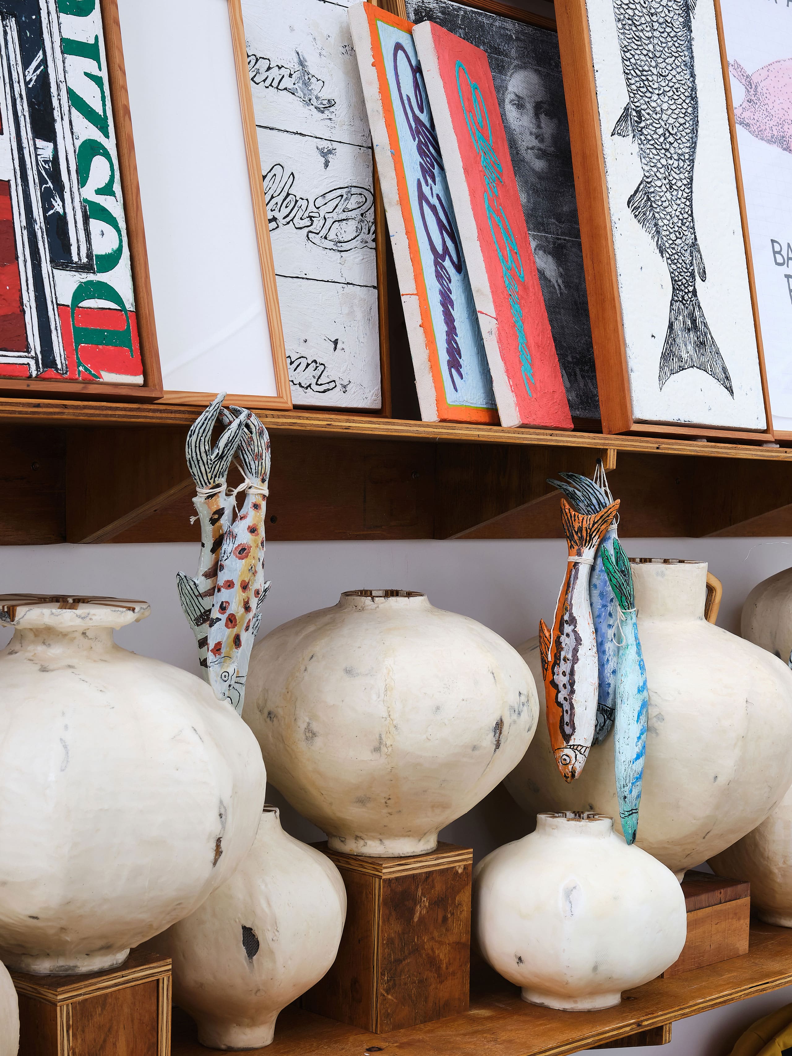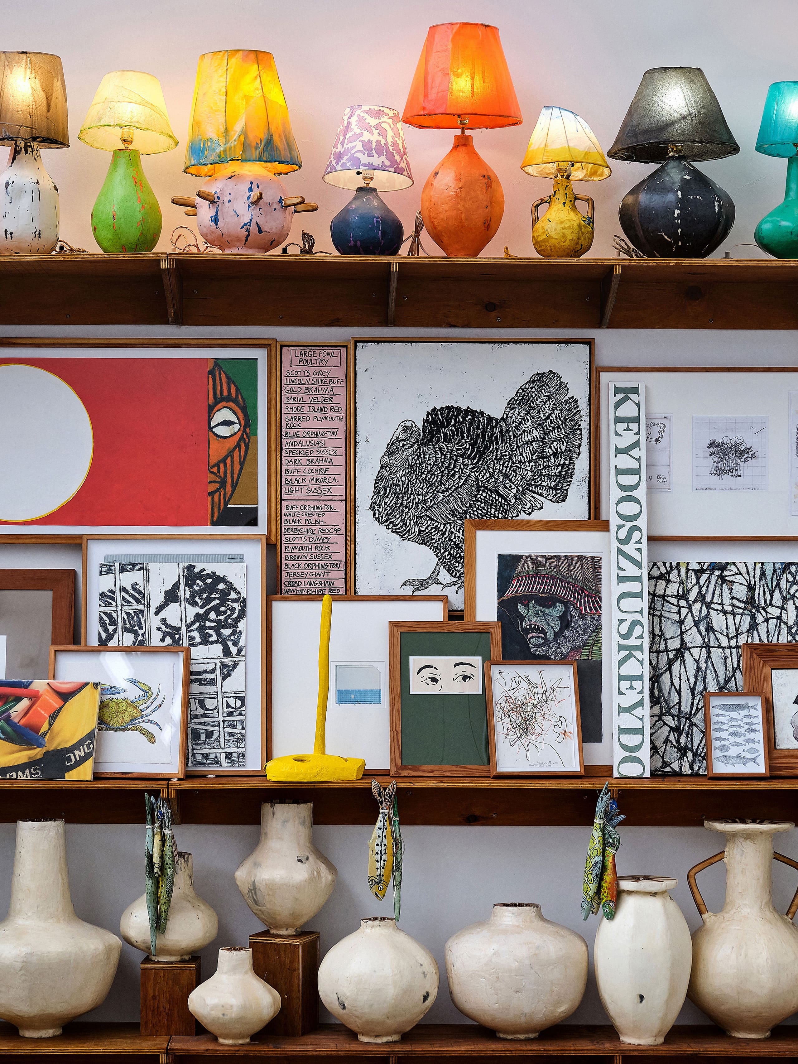 At the top level of the shelves, the lamps light up the entire installation like American billboards or museum lighting that lights up an artwork. This way, the installation conveys a mix of references from high vs. low culture, mass productions vs. craftmanship, pop culture vs. fine art, to personal vs. professional life.