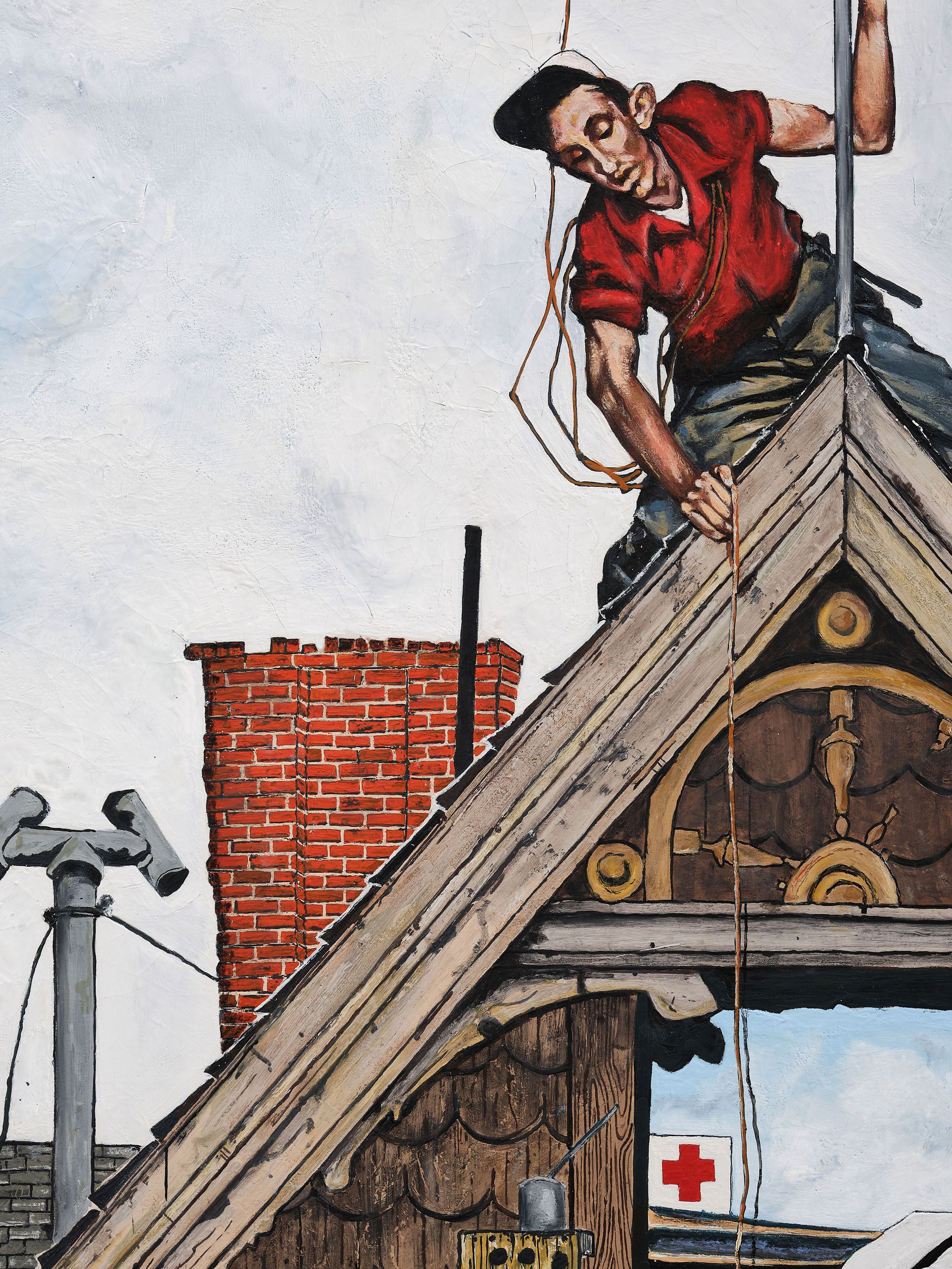 Another title for the painting is New Television Set, and it shows a new television enthusiast having his antenna installed. The general public in America started buying televisions and, with them, television antennas, during the late 1940's.