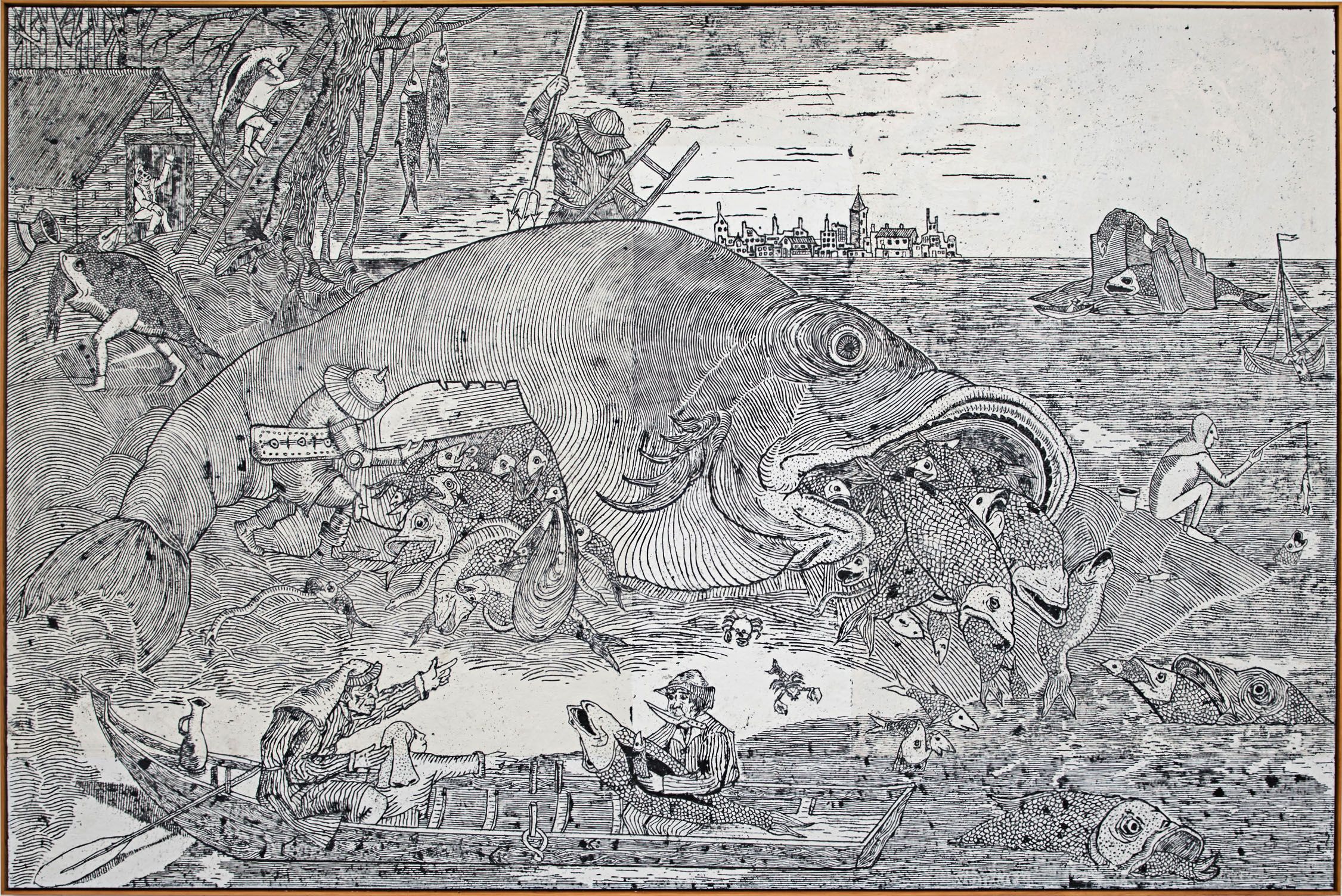 The image depicts many small and large fish tumbling out of the mouth of an enormous beached fish. A small, helmeted figure with an oversized knife slices open the big fish's belly, revealing more marine creatures inside. The surrounding landscape seems to be overrun by a mystical assortment of real and fantastic fish. In the foreground a man accompanied by his son gestures towards the scene, seeming to be the one who understands the morale of the event.