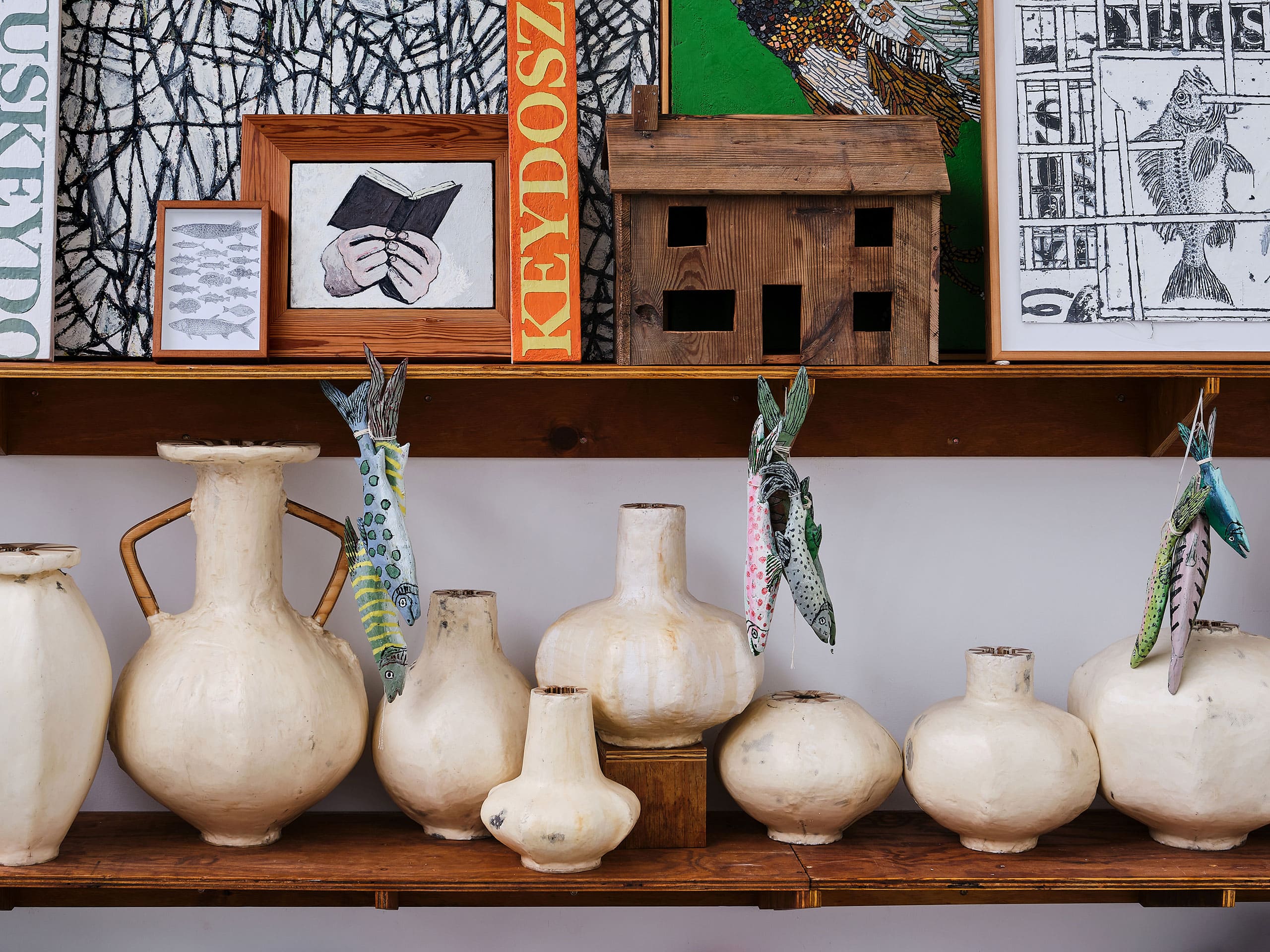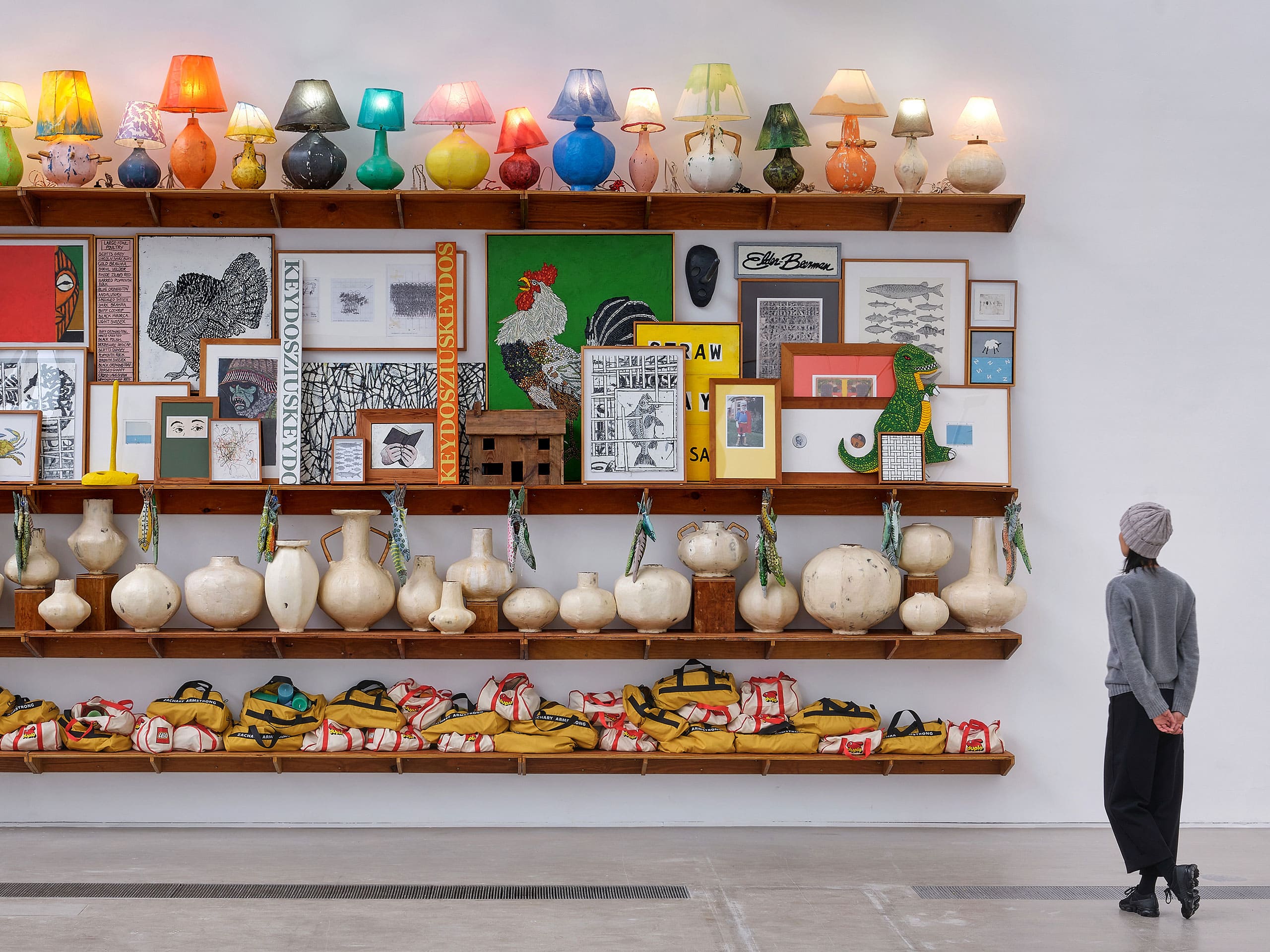 Consisting of shelves with over 200 pieces of lamps, pots, paintings, sketches and bags with candles, the large shelves piece is a mural representing Armstrong’s artistic practice as a whole, with cross-references to other works in the exhibition. Every painting has its counterpart in a sculpture in the exhibition and/or references another work by Armstrong.