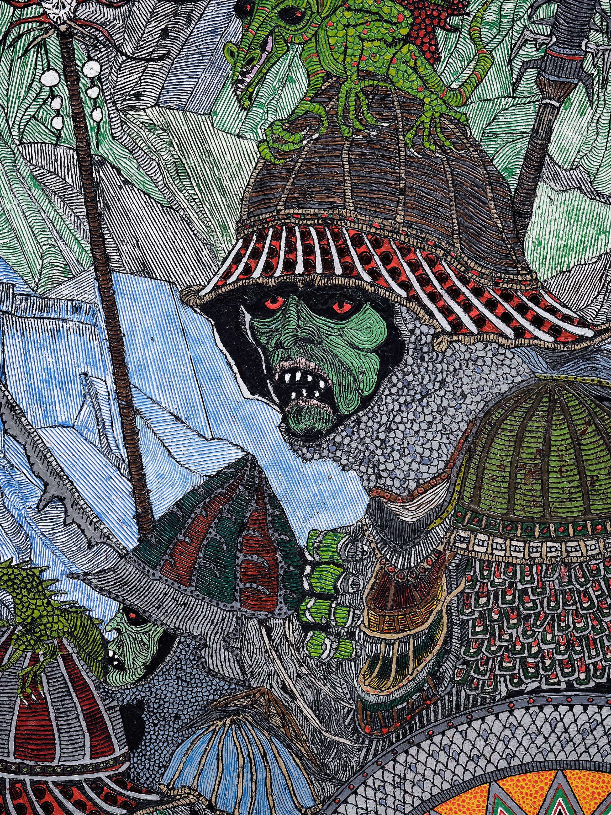 The painting, Double Warrior, is an ode to the British fantasy illustrator and writer Ian Miller (1946). Miller is most known for his unconventional etched gothic style as well as gloomy sensibility and has been recognized for his book cover, magazine cover and interior illustrations.