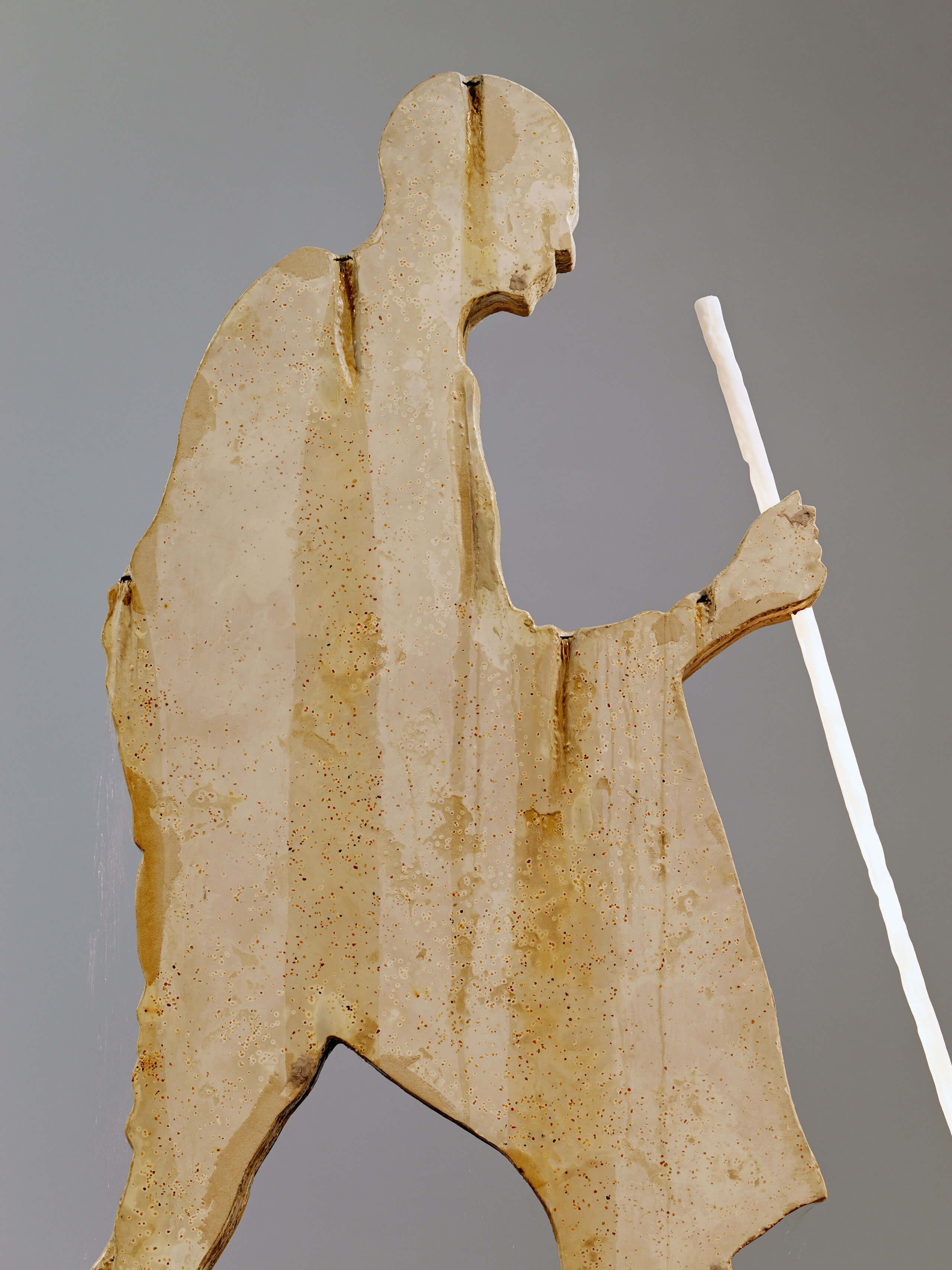In the third darkened room stands a 12-foot rock and concrete sculpture with visual parallels to a brutalist monument, titled Crossing the Border. The slab of stone and concrete is cut in the shape of a silhouetted image of Gandhi. Echoing in the large room we hear patterns of dripping water, the water appearing out of openings in the rock figure.