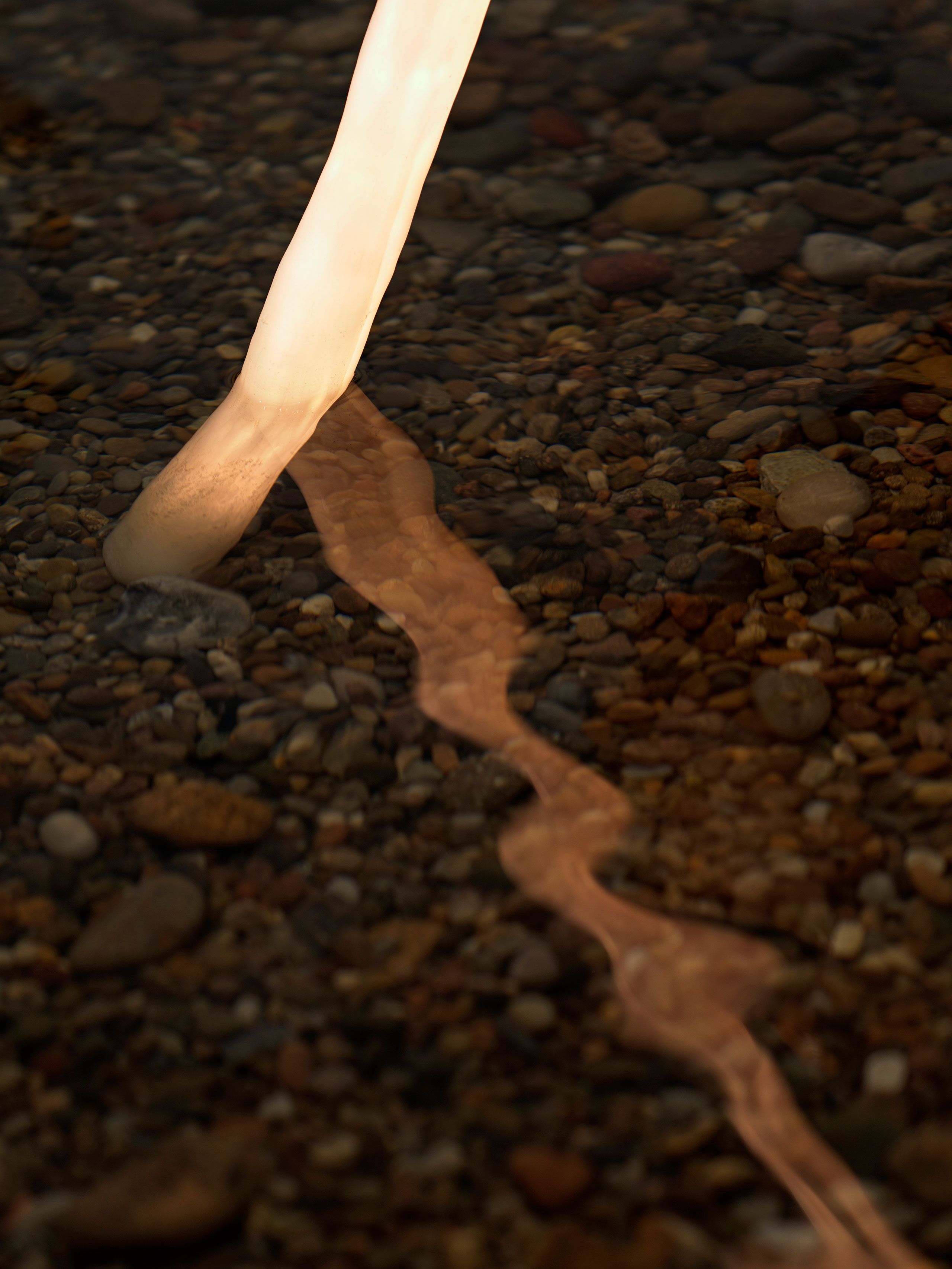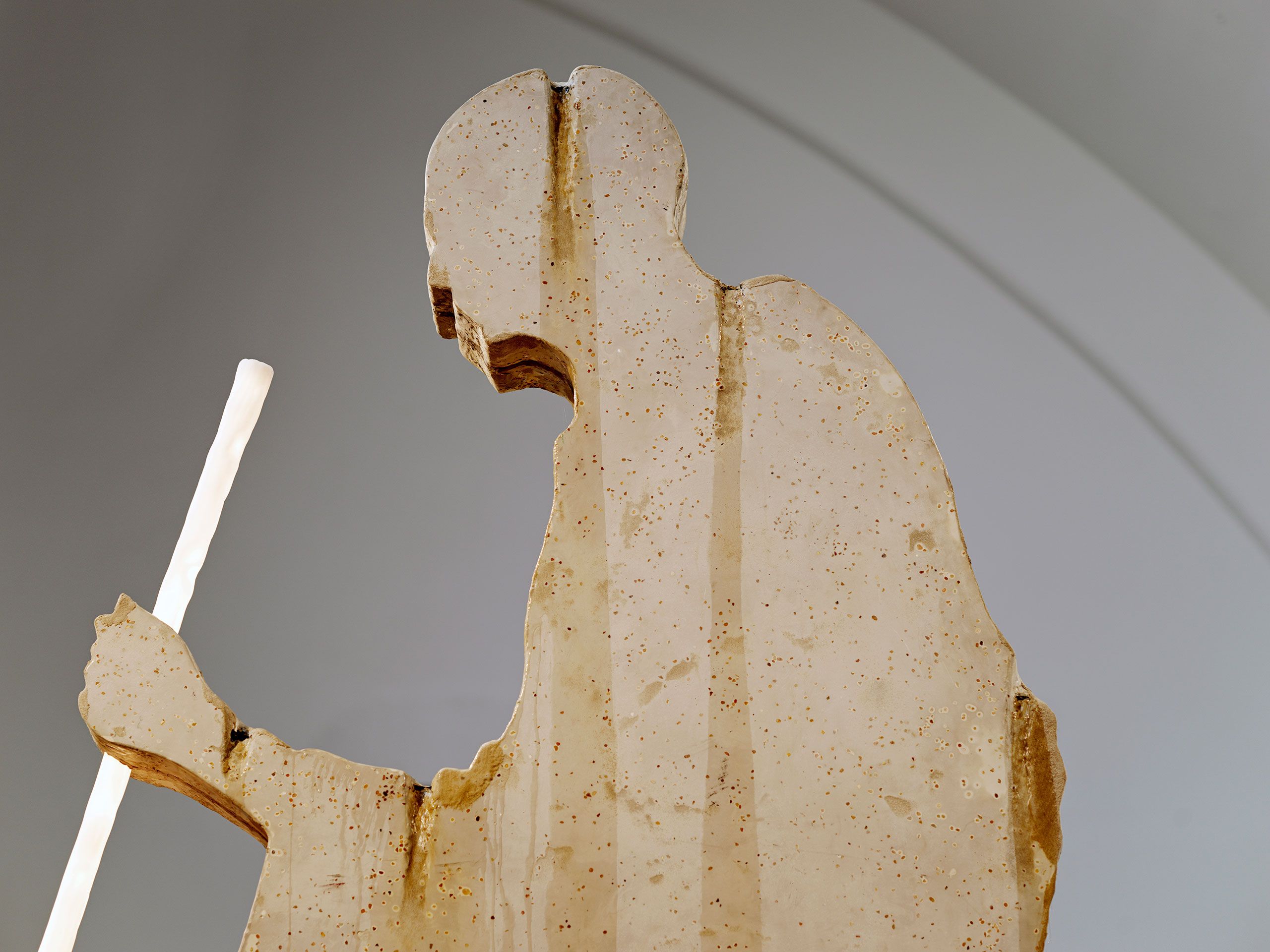 In the second room, the viewer steps directly into 3 Modern Figures (don’t forget to breathe), an installation of three human figures resting on a raw wooden floor. These are not heroic figures but a candid snapshot of modern individuals frozen as if time had stopped. In the empty core of the sculptures, light emanates and pulses.