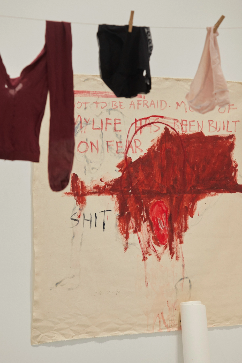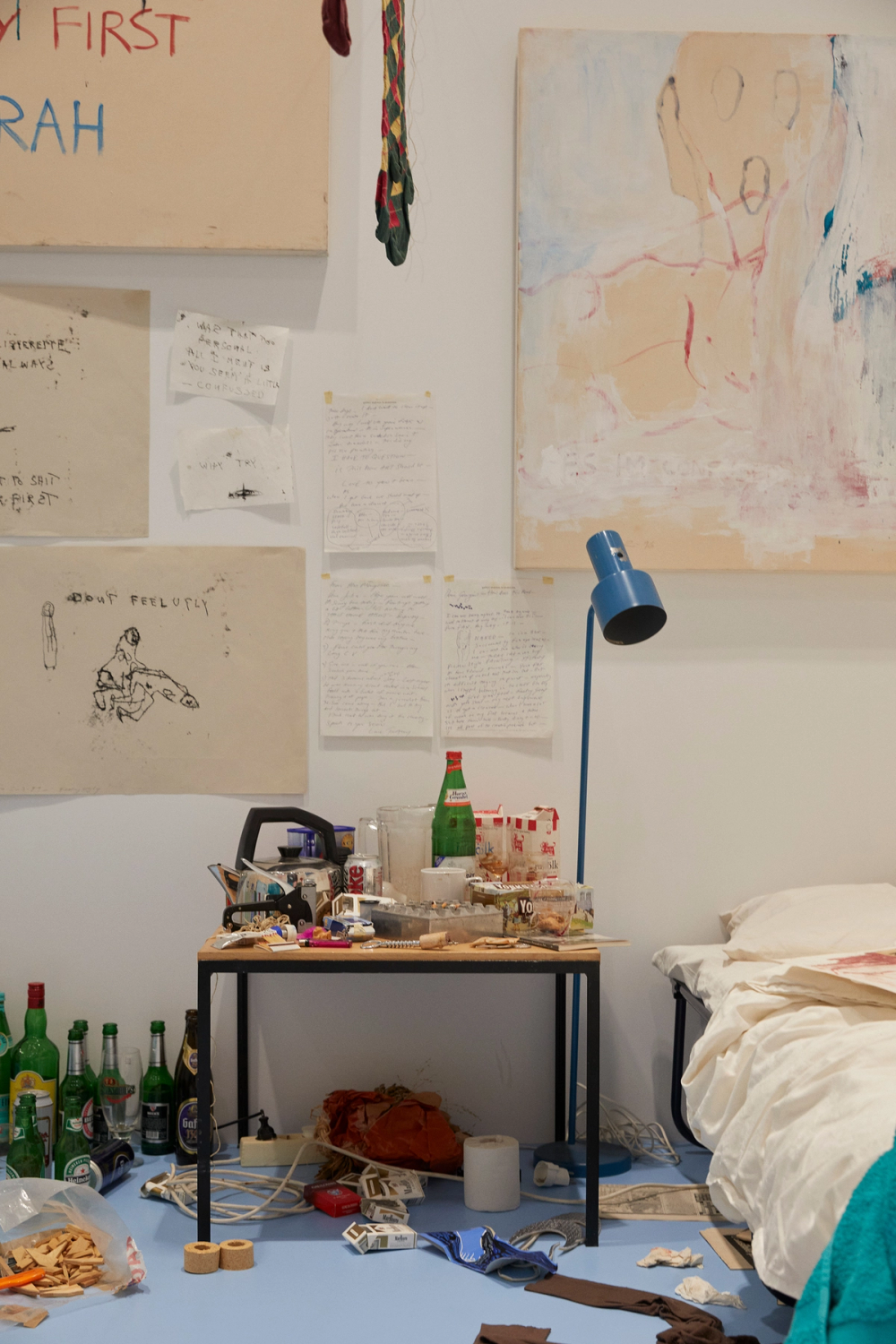 After a traumatic period in the early 90s with two abortions, Tracey Emin could not physically stand the thought of painting and wanted to face her troubled relationship with the medium. Through fish-eye lenses in the exterior walls of the room, visitors could follow glimpses of Emin’s process. The entire collection of artworks and objects in the room were preserved as an installation, which are all exhibited here in their original constellation.