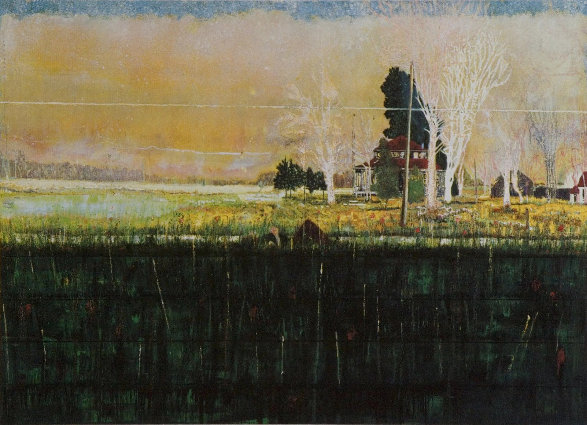 Like the cabins, the canoes function as metaphors for memory. However, if the cabins embody the human struggle to recapture specific moments, the canoes are vehicles for re-enacting drifting states of consciousness. Swamped (1990) is a shifting boat and its lone inhabitant are subsumed by a swirling painterly vortex that disperses like cloud formations across the surface. The canoe gleams from the midst of lagoon, illuminated by the white glow of moon above. All around it, Doig weaves a surging pool of matter that moves seamlessly between lucid reality and abstract delusion.