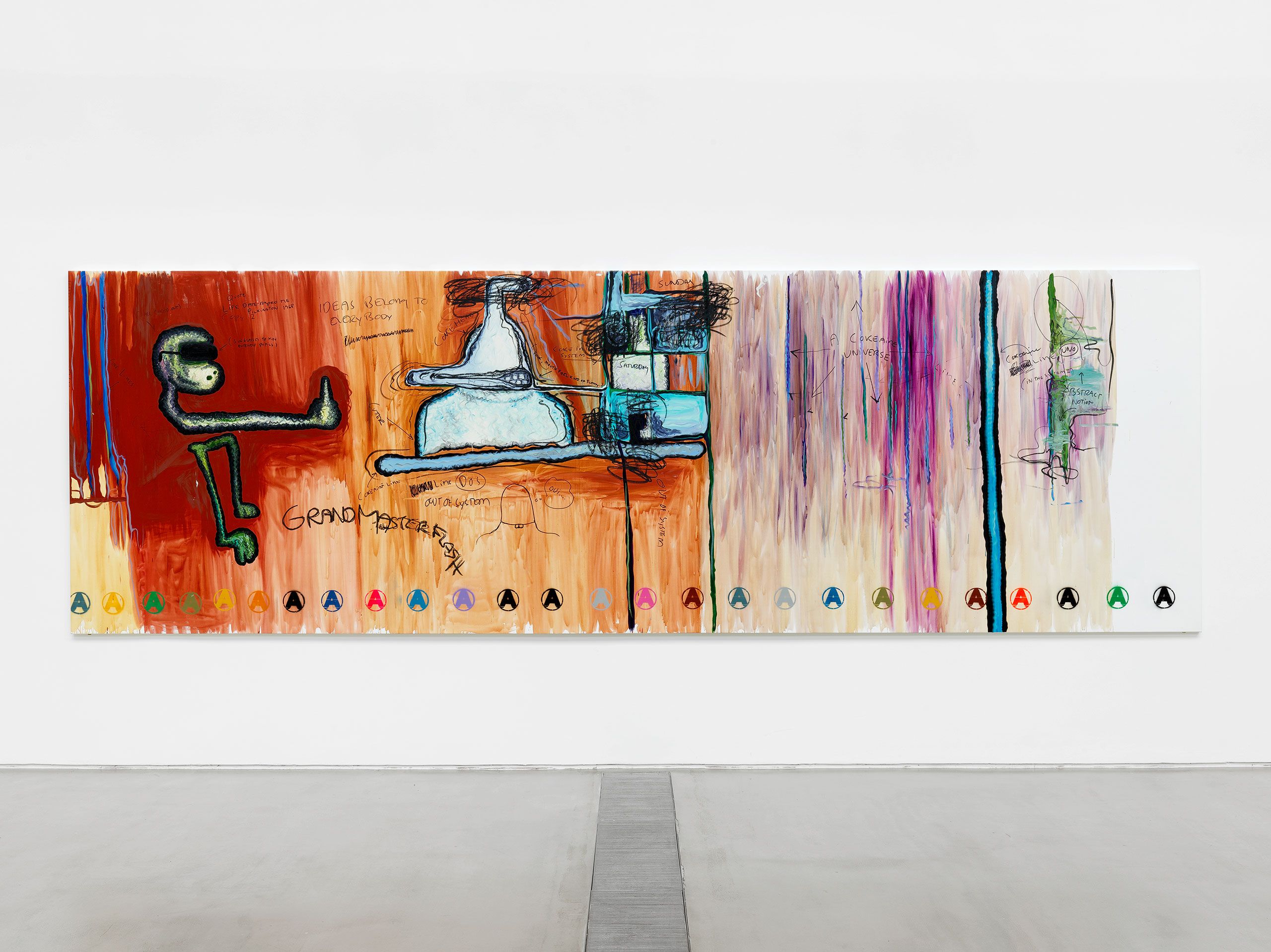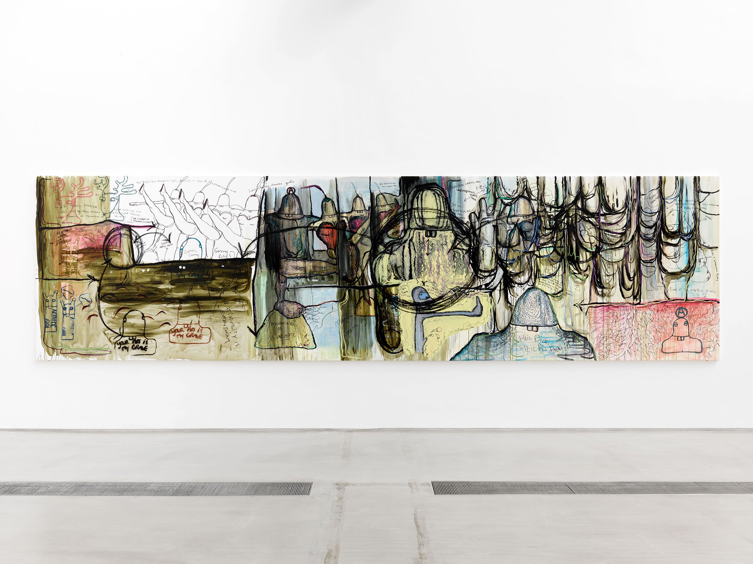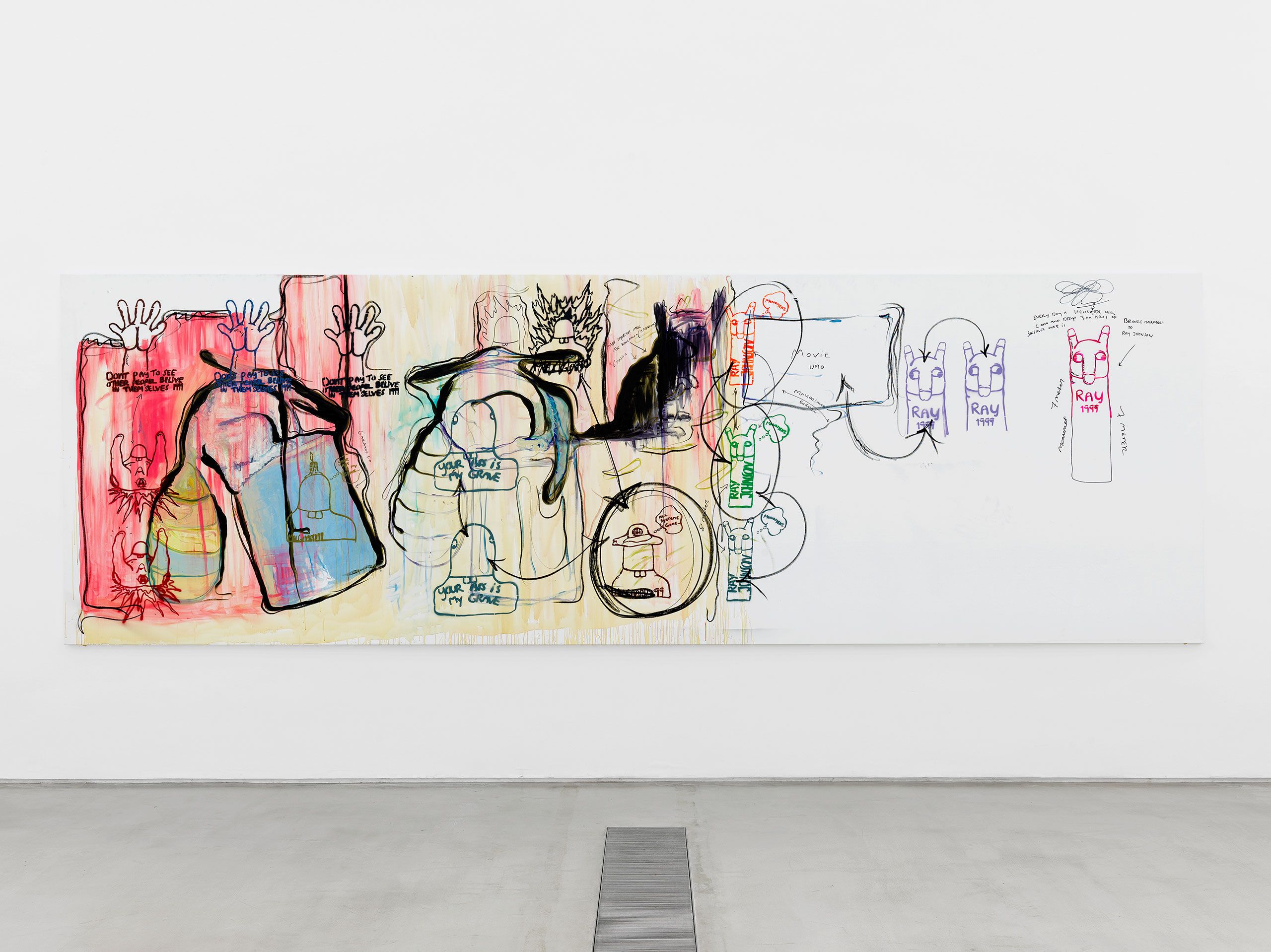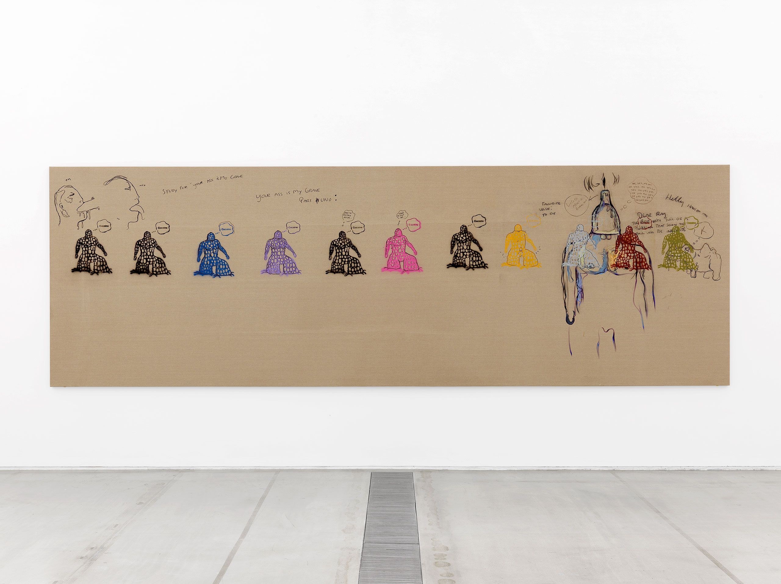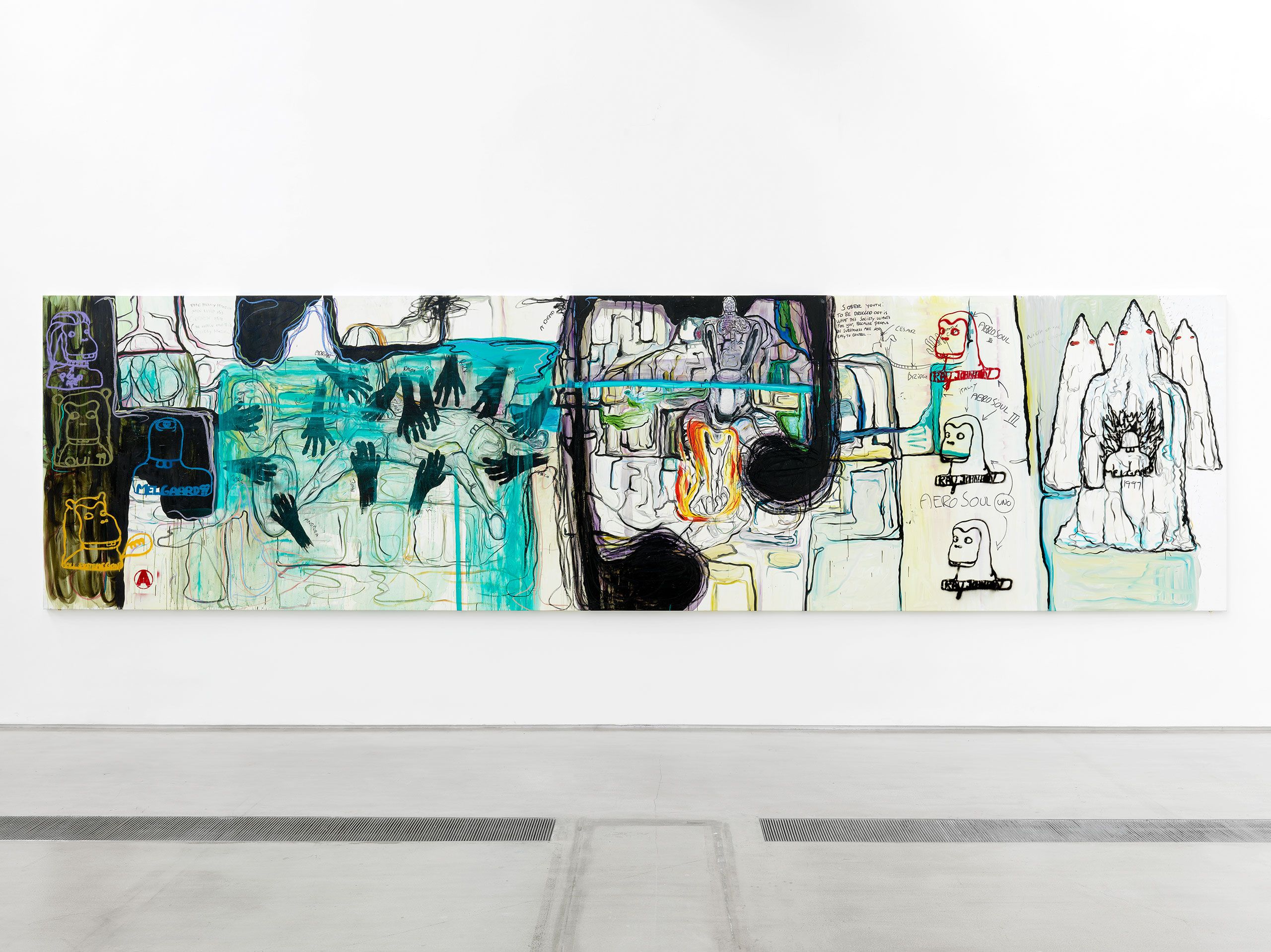The exhibition Bitter Angel at Faurschou Foundation Beijing centres on a series of eight large paintings from 1999, which move within these contrasts between life and its seamier sides. The large tableaux have been executed in Melgaard’s easily recognizable, personal and clearly expressionistic style with firm black contour lines and paint in strong, bright colours in the figuration, with Bjarne Melgaard’s own words and text elements. The paintings can be seen as visual diaries, revolving around art, masculinity, sexuality, and identity.