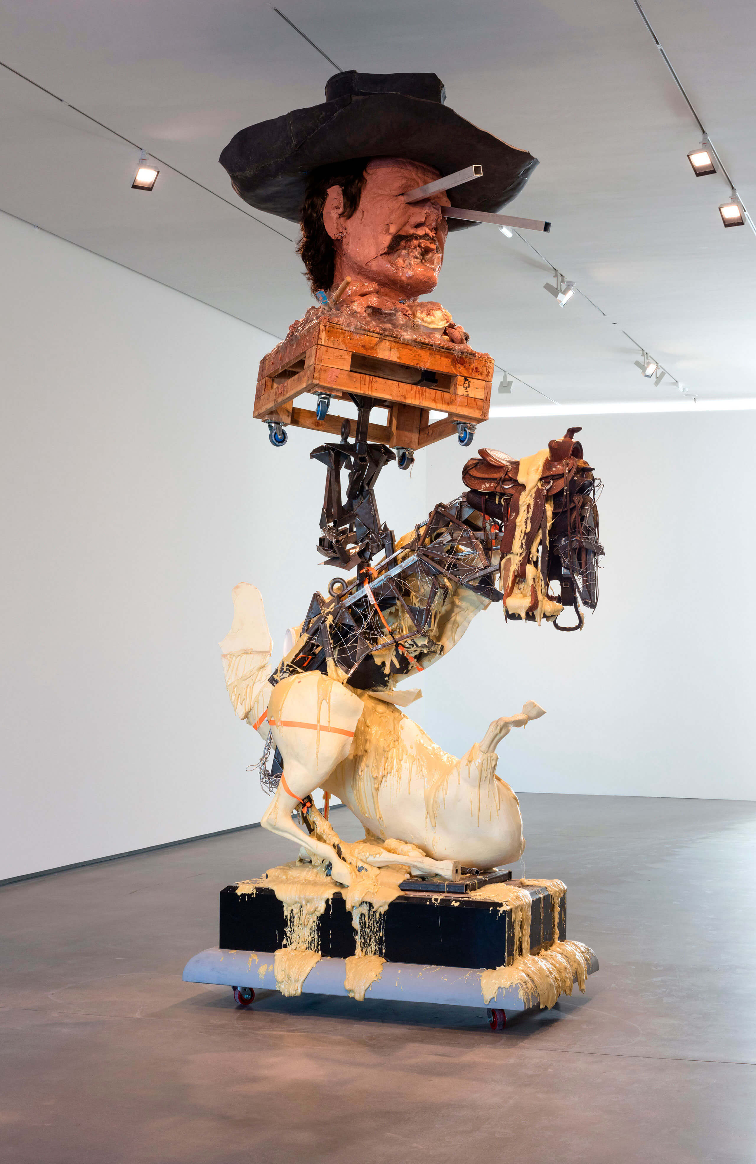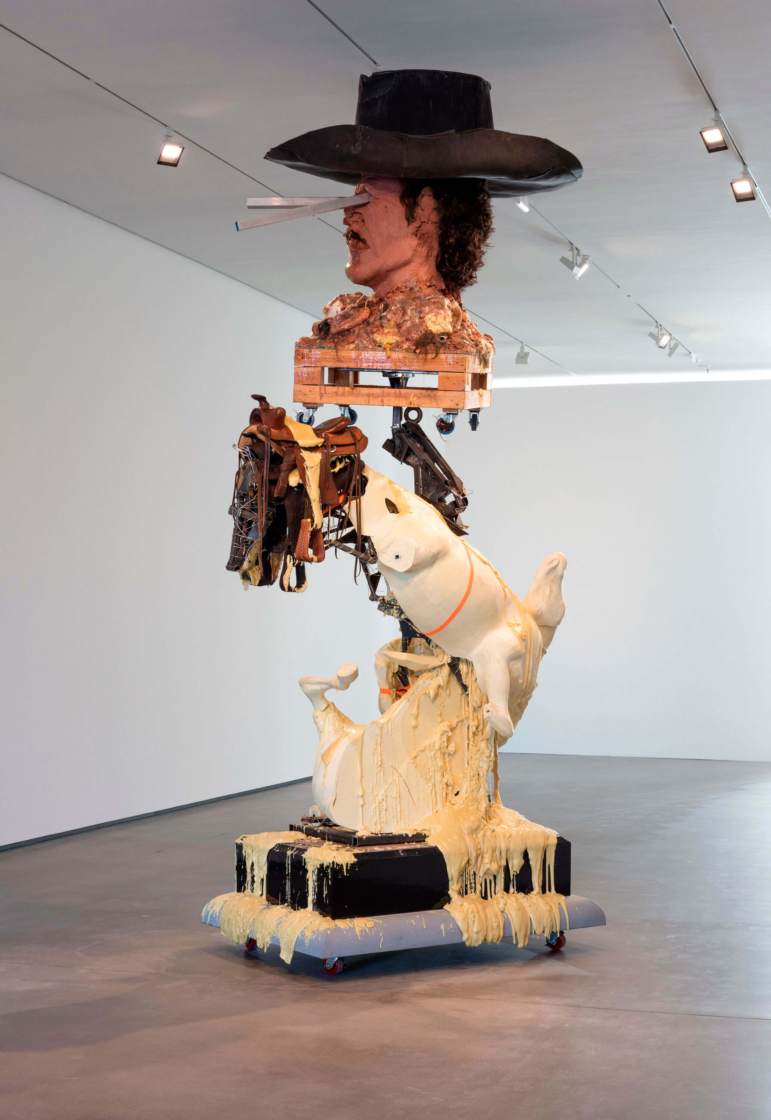 Known for her personal handwritten neon phrases, Tracey Emin adds a third dimension to her words by, for the first time, framing the bright pink neon statement into a large-scale mirrored room. Anselm Kiefer creates his own unique universe between painting and sculpture, using an almost alchemical method of incorporating objects into his canvases. Paul McCarthy and Bjarne Melgaard are both recognized for their provocative approach in addressing tabooed subjects. In the presented piece, McCarthy uses macabre elements creating a vandalized and distorted sculpture, whereas Melgaard questions the concepts of beauty by creating a sculpture of a monstrous hairy creature. The Scandinavian duo, Elmgreen & Dragset, who are well known for their subtle, aesthetic and ironical way of social critique through installation works, question the art institution’s power positions. The assemblage by Ai Weiwei is made of Lego bricks. In 2015, the artist began to integrate Lego in his works, transforming iconic and historical figures and works into new media art by using a mass-produced, commercial material.